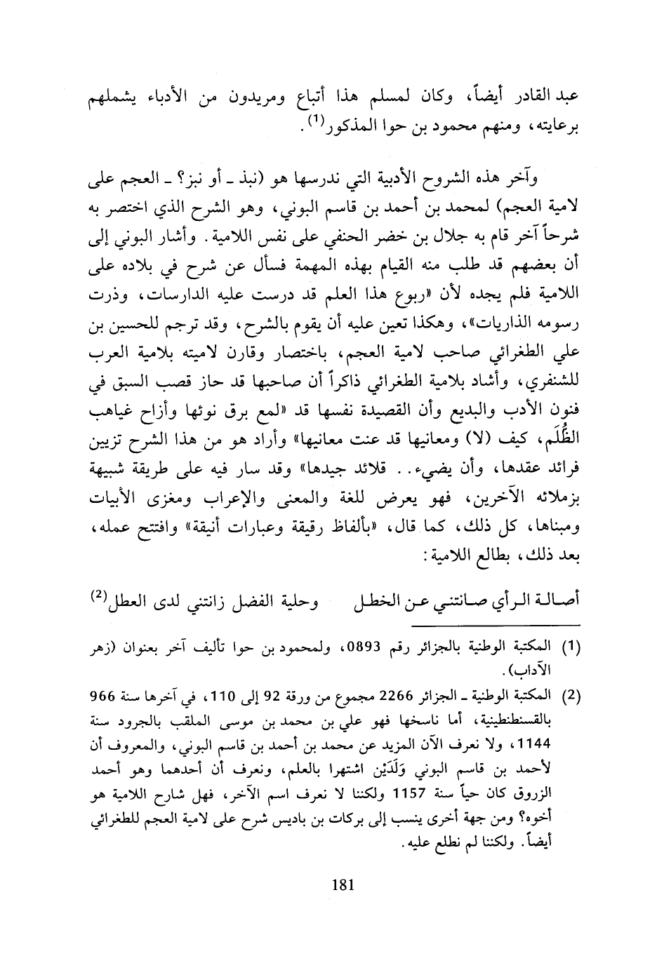 (¬2) المكتبة الوطنية - الجزائر 2266 مجموع من ورقة 92 إلى 110، في آخرها سنة 966 بالقسنطنطينية، أما ناسخها فهو علي بن محمد بن موسى الملقب بالجرود سنة 1144، ولا نعرف الآن المزيد عن محمد بن أحمد بن قاسم البوني، والمعروف أن لأحمد بن قاسم البوني ولدين اشتهرا بالعلم، ونعرف أن أحدهما وهو أحمد الزروق كان حيا سنة 1157 ولكننا لا نعرف اسم الآخر، فهل شارح اللامية هو أخوه؟ ومن جهة أخرى ينسب إلى بركات بن باديس شرح على لامية العجم للطغرائي أيضا. ولكننا لم نطلع عليه.