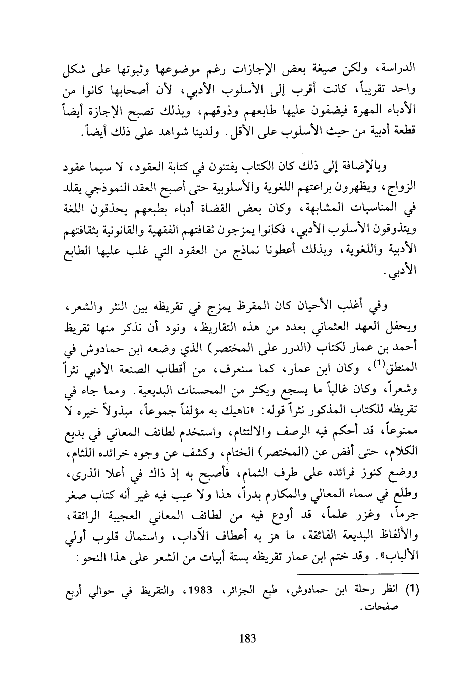 الدراسة، ولكن صيغة بعض الإجازات رغم موضوعها وثبوتها على شكل واحد تقريبا، كانت أقرب إلى الأسلوب الأدبي، لأن أصحابها كانوا من الأدباء المهرة فيضفون عليها طابعهم وذوقهم، وبذلك تصبح الإجازة أيضا قطعة أدبية من حيث الأسلوب على الأقل. ولدينا شواهد على ذلك أيضا.