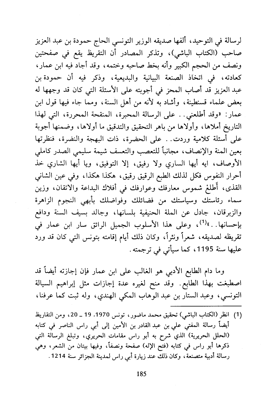 لرسالة في التوحيد، ألفها صديقه الوزير التونسي الحاج حمودة بن عبد العزيز صاحب (الكتاب الباشي)، وتذكر المصادر أن التقريظ يقع في صفحتين ونصف من الحجم الكبير وأنه بخط صاحبه وختمه، وقد أجاد فيه ابن عمار، كعادته، في اتخاذ الصنعة البيانية والبديعية، وذكر فيه أن حمودة بن عبد العزيز قد أصاب المحز في أجوبته على الأسئلة التي كان قد وجهها له بعض علماء قسنطينة، وأشاد به لأنه من أهل السنة، ومما جاء فيها قول ابن عمار: (وقد أطلعني .. على الرسالة المحبرة، المنقحة المحررة، التي لهذا التاريخ أملاها، وأولاها من باهر التحقيق والتدقيق ما أولاها، وضمنها أجوبة على أسئلة كلامية وردت .. على الحضرة، ذات البهجة والنصرة، فنظرتها بعين المنة والإنصاف، مجانبا للتعصب والتعسف شيمة سليمي الصدر كاملي الأوصاف، ايه أيها الساري ولا رفيق، إلا التوفيق، ويا أيها الشاري خذ أحرار النفوس فكل لذلك الطبع الرقيق رقيق، هكذا هكذا، وفي عين الشاني القذى، أطلع شموس معارفك وعوارفك في أفلاك البداعة والاتقان، وزين سماء رئاستك وسياستك من فضائلك وفواضلك بأبهي النجوم الزاهرة والزبرقان، جادل عن الملة الحنيفية بلسانها، وجالد بسيف السنة ودافع بإحسانها ..) (¬1)، وعلى هذا الأسلوب الجميل الرائق سار ابن عمار في تقريظه لصديقه، شعرا ونثرا، وكان ذلك أيام إقامته بتونس التي كان قد ورد عليها سنة 1195، كما سيأتي في ترجمته.