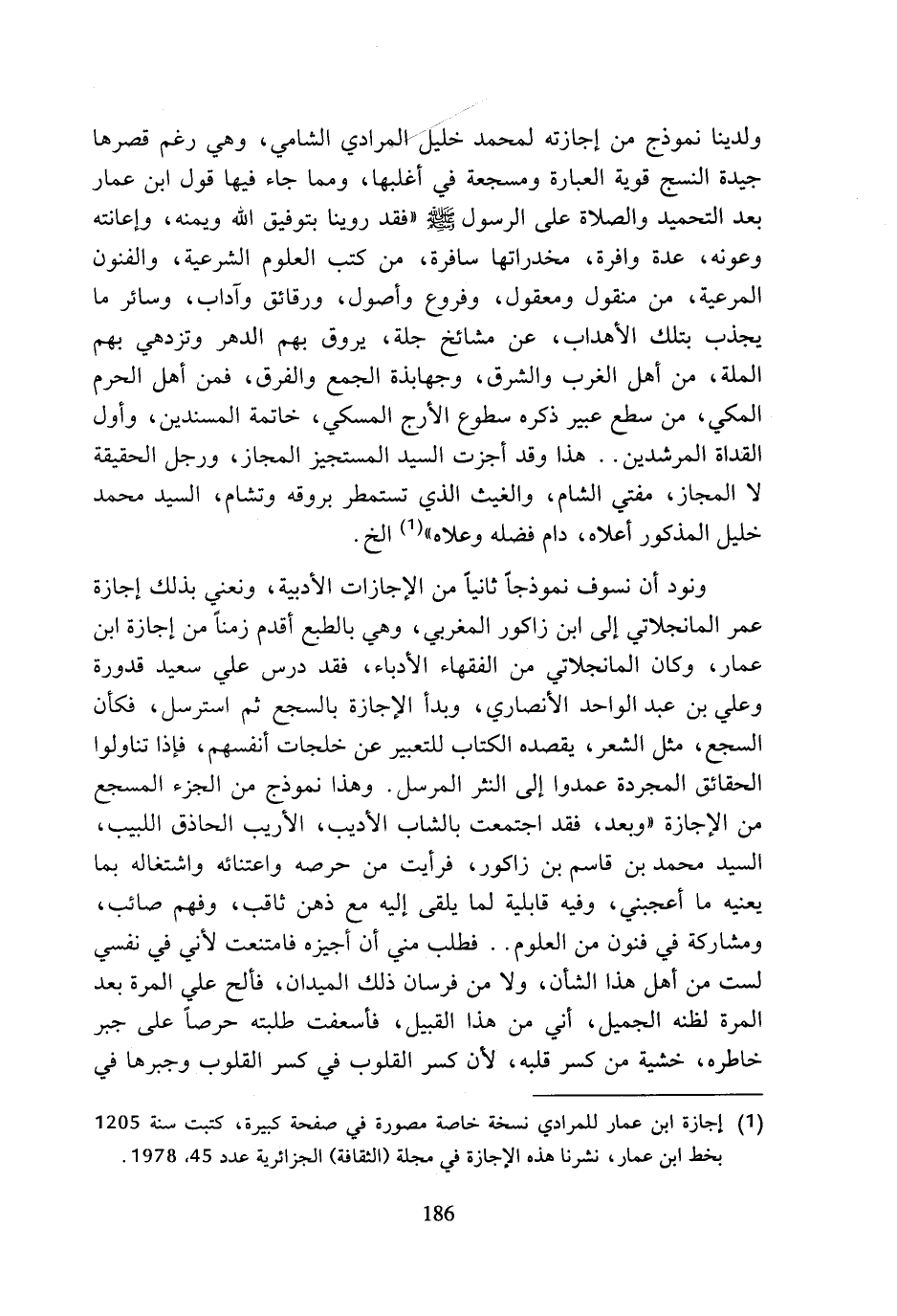 (¬1) إجازة ابن عمار للمرادي نسخة خاصة مصورة في صفحة كبيرة، كتبت سنة 1205 بخط ابن عمار، نشرنا هذه الإجازة في مجلة (الثقافة) الجزائرية عدد 45، 1978.