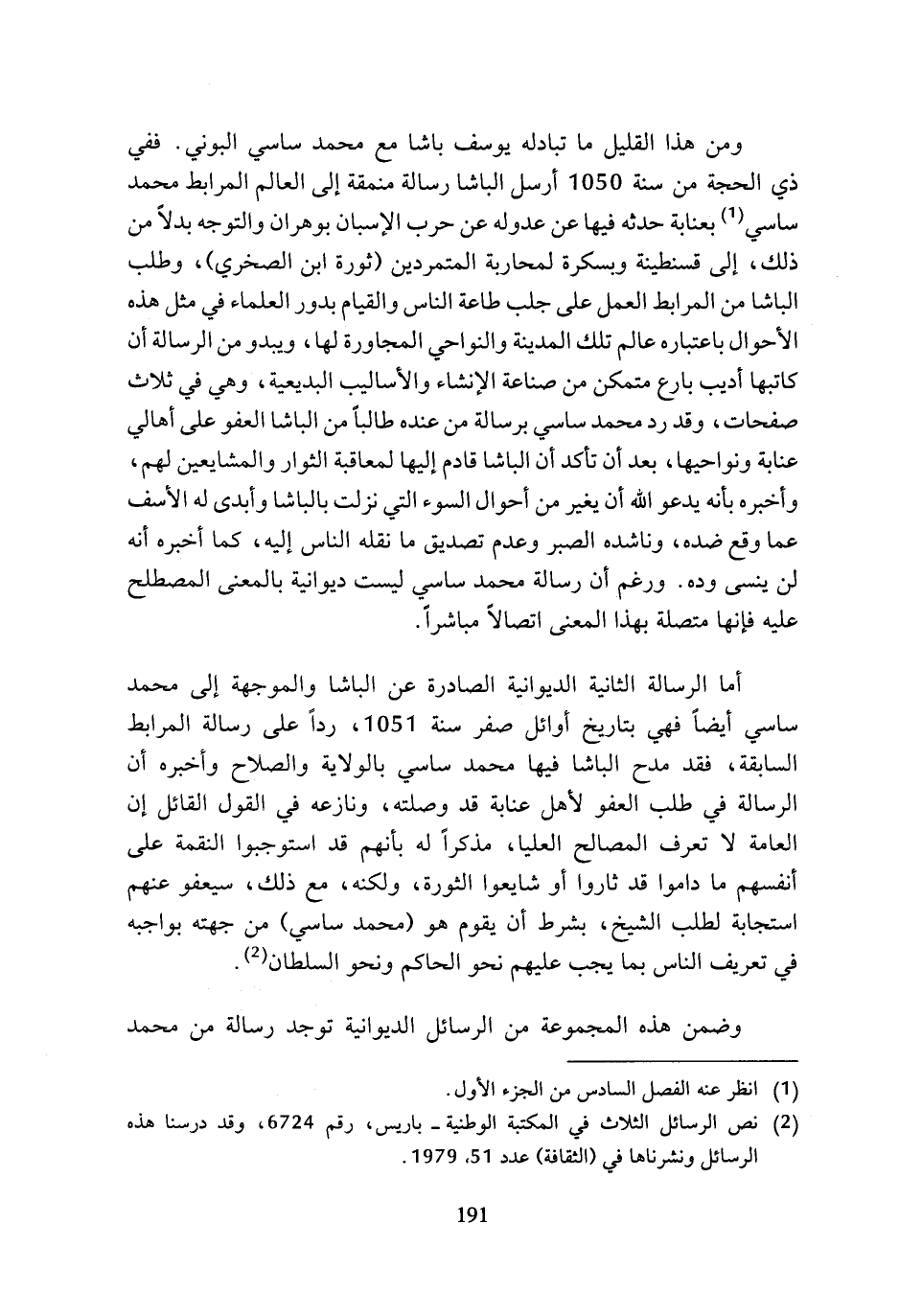 ومن هذا القليل ما تبادله يوسف باشا مع محمد ساسي البوني. ففي ذي الحجة من سنة 1050 أرسل الباشا رسالة منمقة إلى العالم المرابط محمد ساسي (¬1) بعنابة حدثه فيها عن عدوله عن حرب الإسبان بوهران والتوجه بدلا من ذلك، إلى قسنطينة وبسكرة لمحاربة المتمردين (ثورة ابن الصخري)، وطلب الباشا من المرابط العمل على جلب طاعة الناس والقيام بدور العلماء في مثل هذه الأحوال باعتباره عالم تلك المدينة والنواحي المجاورة لها، ويبدو من الرسالة أن كاتبها أديب بارع متمكن من صناعة الإنشاء والأسايب البديعية، وهي في ثلاث صفحات، وقد رد محمد ساسي برسالة من عنده طالبا من الباشا العفو على أهالي عنابة ونواحيها، بعد أن تأكد أن الباشا قادم إليها لمعاقبة الثوار والمشايعين لهم، وأخبره بأنه يدعو الله أن يغير من أحوال السوء التي نزلت بالباشا وأبدى له الأسف عما وقع ضده، وناشده الصبر وعدم تصديق ما نقله الناس إليه، كما أخبره أنه لن ينسى وده. ورغم أن رسالة محمد ساسي ليست ديوانية بالمعنى المصطلح عليه فإنها متصلة بهذا المعنى اتصالا مباشرا.