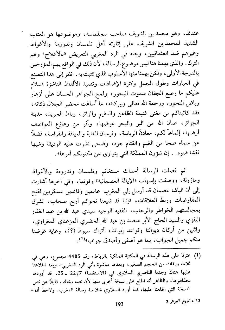 عندئذ، وهو محمد بن الشريف صاحب سجلماسة، وموضوعها هو العتاب الشديد لمحمد بن الشريف على إثارته أهل تلمسان وندرومة والأغواط وغيرهم ضد العثمانيين، وجاء في الرد المغربي التعريض (بالأعلاج) وهم الترك. والذي يهمنا هنا ليس موضوع الرسالة، لأن ذلك في الواقع يهم المؤرخين بالدرجة الأولى، ولكن يهمنا منها الأسلوب الذي كتبت به. انظر إلى هذا التصنع في العبارات وطول الجمل وكثرة الإضافات وتصيد الألفاط الناشزة (سلام عليكم ما رصع الجفان سموت البحور، ولمح الجواهر الحسان على أزهار رياض النحور، ورحمة الله تعالى وببركاته، ما أساغت محضر الجلال ذكاته، فقد كاتبنا كم من مغنى غنيمة الظاعن والمقيم والزائر، رباط الجريد، مدينة الجزائر، صان الله من البر والبحر عرضها، وأقر من زعازع العواصف أرضها، إلماعا لكم، معادن الرياسة، وفرسان الغابة والعيافة والفراسة، فضلا عن سماء صحا من الغيم والقتام جوه، وضحى نشرت عليه الوديقة وشيها ففشا ضوه. . إن شؤون المملكة التي يتوارى عن مكنونهم أمرها).