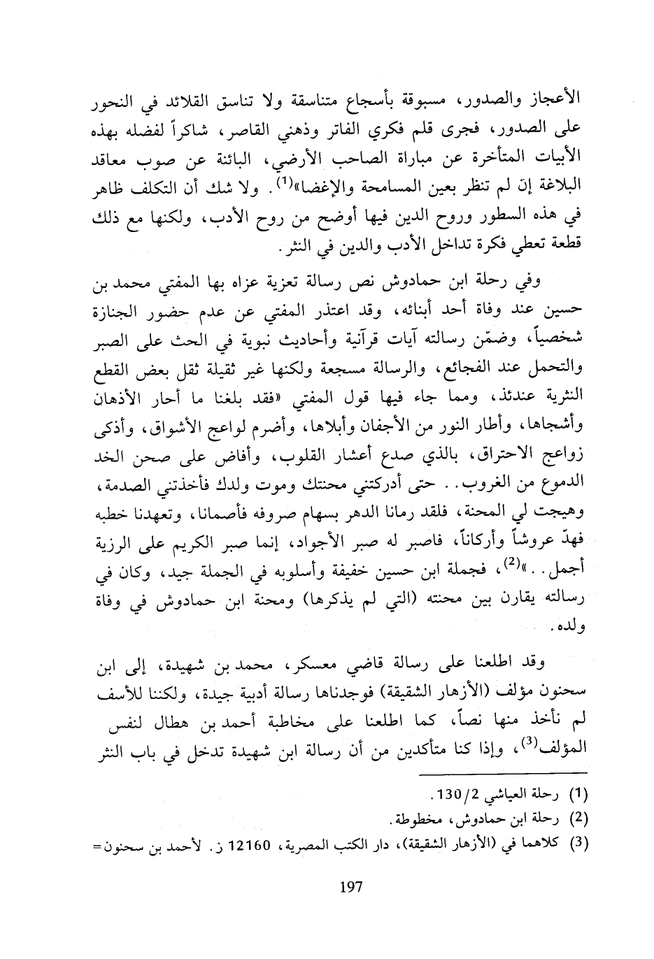 وفي رحلة ابن حمادوش نص رسالة تعزية عزاه بها المفتي محمد بن حسين عند وفاة أحد أبنائه، وقد اعتذر المفتي عن عدم حضور الجنازة شخصيا، وضمن رسالته آيات قرآنية وأحاديث نبوية في الحث على الصبر والتحمل عند الفجائع، والرسالة مسجعة ولكنها غير ثقيلة ثقل بعض القطع النثرية عندئذ، ومما جاء فيها قول المفتي (فقد بلغنا ما أحار الأذهان وأشجاها، وأطار النور من الأجفان وأبلاها، وأضرم لواعج الأشواق، وأذكى زواعج الاحتراق، بالذي صدع أعشار القلوب، وأفاض على صحن الخد الدموع من الغروب .. حتى أدركتني محنتك وموت ولدك فأخذتني الصدمة، وهيجت لي المحنة، فلقد رمانا الدهر بسهام صروفه فأصمانا، وتعهدنا خطبه فهذ عروشا وأركانا، فاصبر له صبر الأجواد، إنما صبر الكريم على الرزيه أجمل ..) (¬2)، فجملة ابن حسين خفيفة وأسلوبه في الجملة جيد، وكان في رسالته يقارن بين محنته (التي لم يذكرها) ومحنة ابن حمادوش في وفاة ولده.