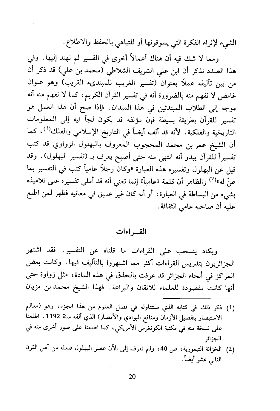 ومما لا شك فيه أن هنالى أعمالا أخرى في التفسير لم نهتد إليها. وفي هذا الصدد نذكر أن ابن علي الشريف الشلاطي (محمد بن علي) قد ذكر أن من بين تآليفه عملا بعنوان (تفسير الغريب للمبتدئ القريب) وهو عنوان غامض لا نفهم منه بالضرورة أنه في تفسير القرآن الكريم، كما لا نفهم منه أنه موجه إلى الطلاب المبتدئين في هذا الميدان. فإذا صح أن هذا العمل هو تفسير للقرآن بطريقة بسيطة فإن مؤلفه قد يكون لجأ فيه إلى المعلومات التاريخية والفلكية، لأنه قد ألف أيضا في التاريخ الإسلامي والفلك (¬1)، كما أن الشيخ عمر بن محمد المحجوب المعروف بالبهلول الزواوي قد كتب تفسيرا للقرآن يبدو أنه انتهى منه حتى أصبح يعرف بـ (تفسير البهلول). وقد قيل عن البهلول وتفسيره هذه العبارة "وكان رجلا عاميا كتب في التفسير بما عنّ له " (¬2) والظاهر أن كلمة "عاميا" إنما تعني أنه قد أملى تفسيره على تلاميذه بشيء من البساطة في العبارة، أو أنه كان غير عميق في معانيه فظهر لمن اطلع عليه أن صاحبه عامي الثقافة.