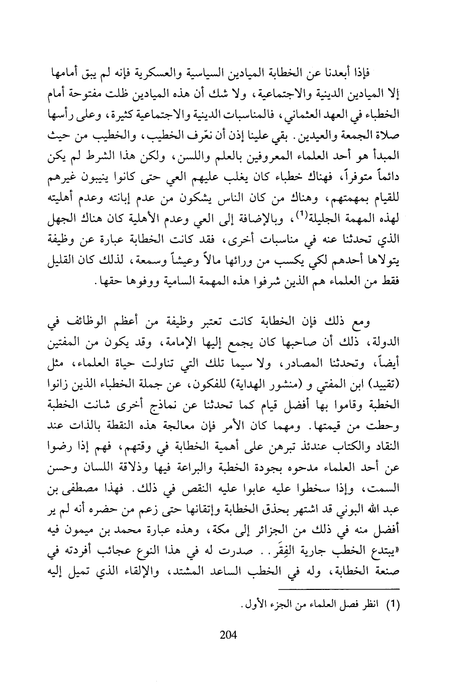 فإذا أبعدنا عن الخطابة الميادين السياسية والعسكرية فإنه لم يبق أمامها إلا الميادين الدينية والاجتماعية، ولا شك أن هذه الميادين ظلت مفتوحة أمام الخطباء في العهد العثماني، فالمناسبات الدينية والاجتماعية كثيرة، وعلى رأسها صلاة الجمعة والعيدين. بقي علينا إذن أن نعرف الخطيب، والخطيب من حيث المبدأ هو أحد العلماء المعروفين بالعلم واللسان، ولكن هذا الشرط لم يكن دائما متوفرا، فهناك خطباء كان يغلب عليهم العي حتى كانوا ينيبون غيرهم للقيام بمهمتهم، وهناك من كان الناس يشكون من عدم إبانته وعدم أهليته لهذه المهمة الجليلة (¬1)، وبالإضافة إلى العي وعدم الأهلية كان هناك الجهل الذي تحدثنا عنه في مناسبات أخرى، فقد كانت الخطابة عبارة عن وظيفة يتولاها أحدهم لكي يكسب من ورائها مالا وعيشا وسمعة، لذلك كان القليل فقط من العلماء هم الذين شرفوا هذه المهمة السامية ووفوها حقها.