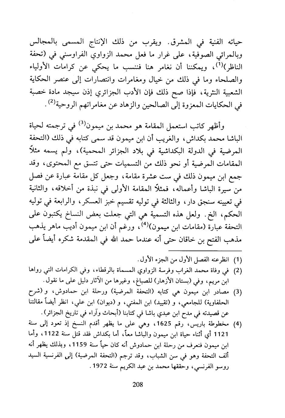 وأظهر كاتب استعمل المقامة هو محمد بن ميمون (¬3) في ترجمته لحياة الباشا محمد بكداش، والغريب أن ابن ميمون قد سمى كتابه في ذلك (التحفة المرضية في الدولة البكداشية في بلاد الجزائر المحمية)، ولم يسمه مثلا المقامات المرضية أو نحو ذلك من التسميات حتى تتسق مع المحتوى، وقد جمع ابن ميمون ذلك في ست عشرة مقامة، وجعل كل مقامة عبارة عن فصل من سيرة الباشا وأعماله، فمثلا المقامة الأولى في نبذة من أخلاقه، والثانية في تعيينه سنجق دار، والثالثة في توليه تقسيم خبز العسكر، والرابعة في توليه الحكم، الخ. ولعل هذه التسمية هي التي جعلت بعض النساخ يكتبون على التحفة عبارة (مقامات ابن ميمون) (¬4)، ورغم أن ابن ميمون أديب ماهر يذهب مذهب الفتح بن خاقان حتى أنه عندما حمد الله في المقدمة شكره أيضا على