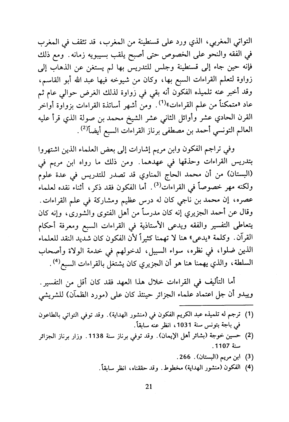 وفي تراجم الفكون وابن مريم إشارات إلى بعض العلماء الذين اشتهروا بتدريس القراءات وحذقها في عهدهما. ومن ذلك ما رواه ابن مريم في (البستان) من أن محمد الحاج المناوي قد تصدر للتدريس في عدة علوم ولكنه مهر خصوصا في القراءات (¬3). أما الفكون فقد ذكر، أثناء نقده لعلماء عصره، إن محمد بن ناجي كان له درس عظيم ومشاركة في علم القراءات. وقال عن أحمد الجزيري إنه كان مدرسا من أهل الفتوى والشورى، وإنه كان يتعاطى التفسير والفقه ويدعى الأستاذية في القراءات السبع ومعرفة أحكام القرآن. وكلمة (يدعى) هنا لا تهمنا كثيرا لأن الفكون كان شديد النقد للعلماء الذين ضلوا، في نظره، سواء السبيل، لدخولهم في خدمة الولاة وأصحاب السلطة، والذي يهمنا هنا هو أن الجزيري كان يشتغل بالقراءات السبع (¬4).