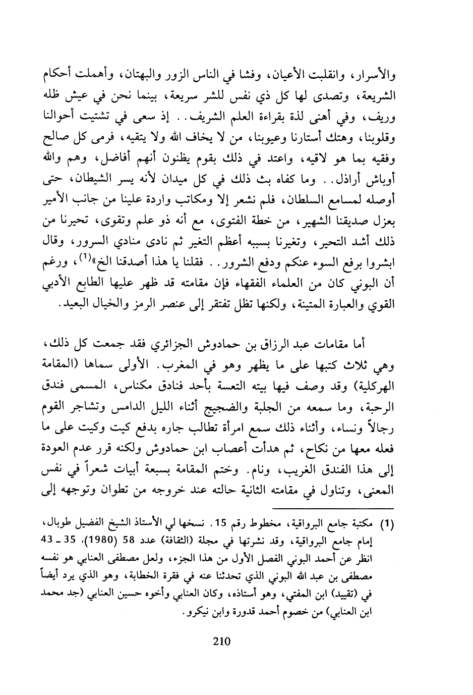 (¬1) مكتبة جامع البرواقية، مخطوط رقم 15. نسخها لي الأستاذ الشيخ الفضيل طوبال، إمام جامع البرواقية، وقد نشرتها في مجلة (الثقافة) عدد 58 (1980)، 35 - 43 انظر عن أحمد البوني الفصل الأول من هذا الجزء، ولعل مصطفى العنابي هو نفسه مصطفى بن عبد الله البوني الذي تحدثنا عنه في فقرة الخطابة، وهو الذي يرد أيضا في (تقييد) ابن المفتي، وهو أستاذه، وكان العنابي وأخوه حسين العنابي (جد محمد