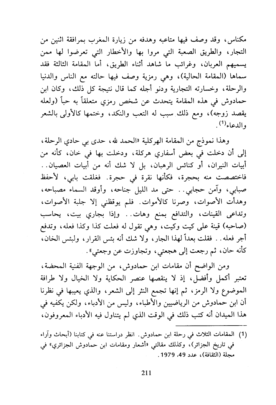 (¬1) المقامات الثلاث في رحلة ابن حمادوش. انظر دراستنا عنه في كتابنا (أبحاث وآراء في تاريخ الجزائر)، وكذلك مقالتي (أشعار ومقامات ابن حمادوش الجزائري) في مجلة (الثقافة)، عدد 49، 1979.
