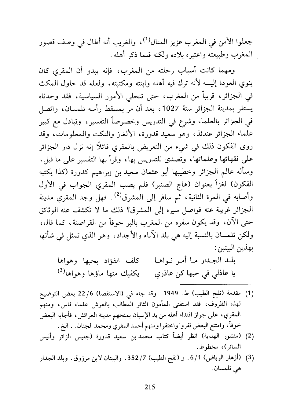 ومهما كانت أسباب رحلته من المغرب، فإنه يبدو أن المقري كان ينوي العودة إليه لأنه ترك فيه أهله وابنته ومكتبته، ولعله قد حاول المكث في الجزائر، قريبا من المغرب، حتى تنجلي الأمور السياسية، فقد وجدناه يستقر بمدينة الجزائر سنة 1027، بعد أن مر بمسقط رأسه تلمسان، واتصل في الجزائر بالعلماء وشرع في التدريس وخصوصا التفسير، وتبادل مع كبير علماء الجزائر عندئذ، وهو سعيد قدورة، الألغاز والنكت والمعلومات، وقد روى الفكون ذلك في شيء من التعريض بالمقري قائلا إنه نزل دار الجزائر على فقهائها وعلمائها، وتصدى للتدريس بها، وقرأ بها التفسير على ما قيل، وسأله عالم الجزائر وخطيبها أبو عثمان سعيد بن إبراهيم كدورة (كذا يكتبه الفكون) لغزا بعنوان (هاج الصنبر) فلم يصب المقري الجواب في الأول وأصابه في المرة الثانية، ثم سافر إلى المشرق (¬2). فهل وجد المقري مدينة الجزائر غريبة عنه فواصل سيره إلى المشرق؟ ذلك ما لا تكشف عنه الوثائق حتى الآن، وقد يكون سفره من المغرب بالبر خوفا من القراصنة، كما قال، ولكن تلمسان بالنسبة إليه هي بلد الآباء والأجداد، وهو الذي تمثل في شأنها بهذين البيتين: