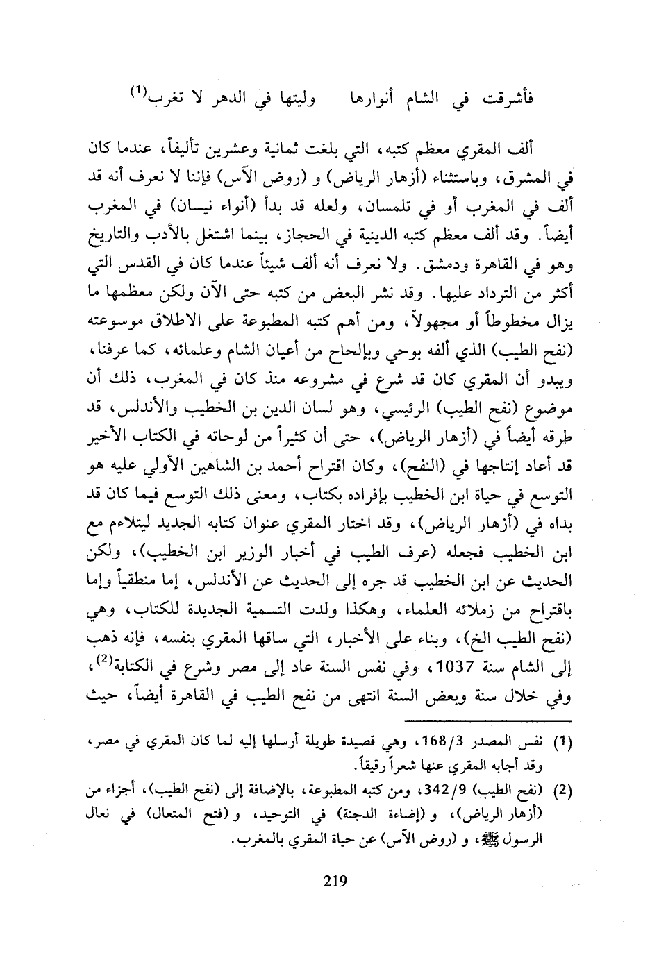(¬2) (نفح الطيب) 9/ 342، ومن كتبه المطبوعة، بالإضافة إلى (نفح الطيب)، أجزاء من (أزهار الرياض)، و (إضاءة الدجنة) في التوحيد، و (فتح المتعال) في نعال الرسول (صلى الله عليه وسلم)، و (روض الآس) عن حياة المقري بالمغرب.