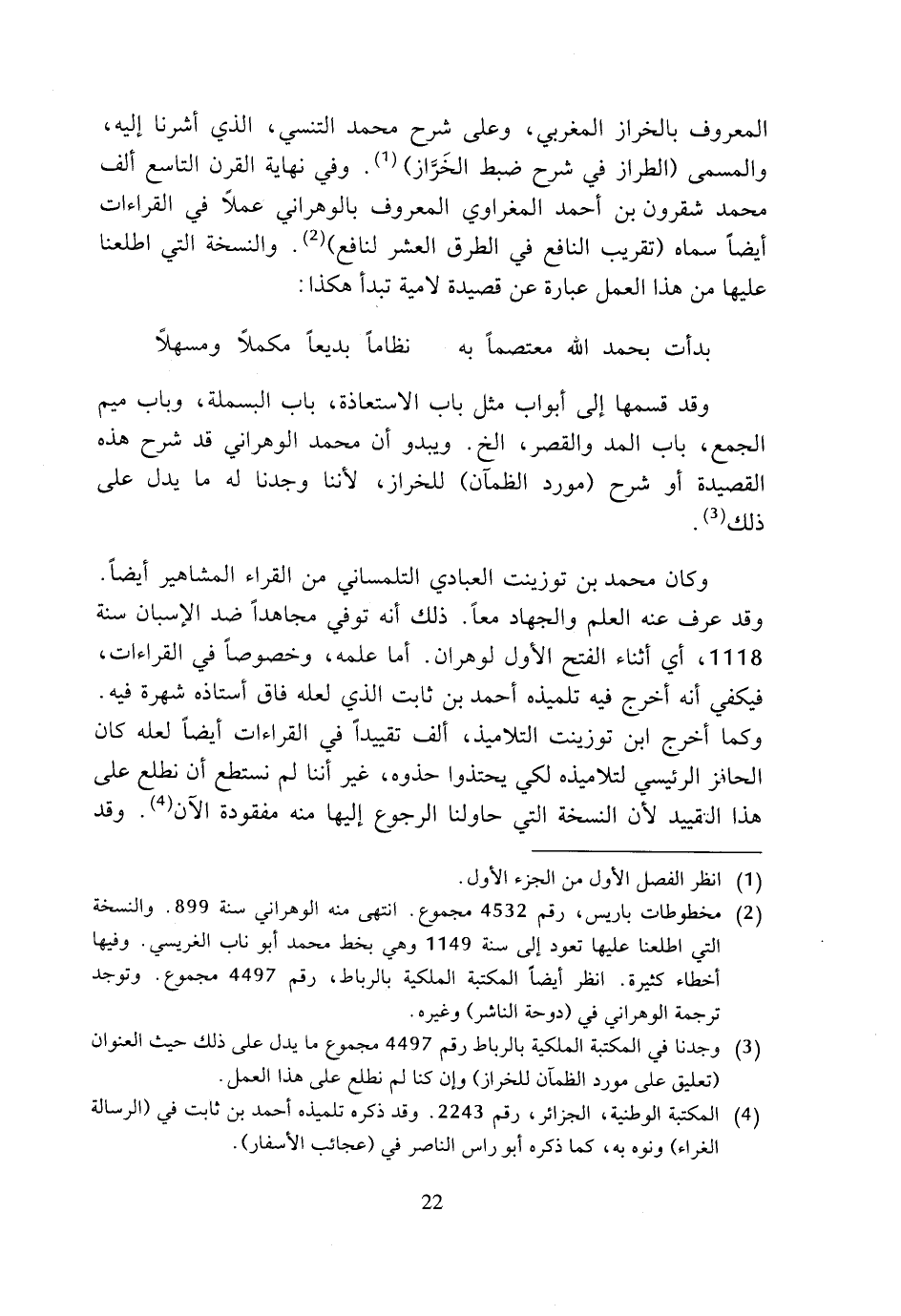 (¬3) وجدنا في المكتبة الملكية بالرباط رقم 4497 مجموع ما يدل على ذلك حيث العنوان (تعليق على مورد الظمآن للخراز) وإن كنا لم نطلع على هذا العمل.