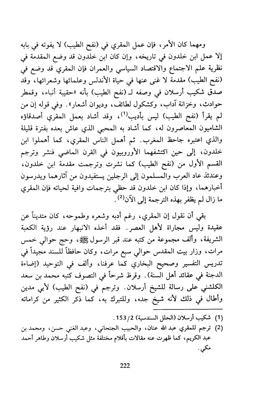ومهما كان الأمر، فإن عمل المقري في (نفح الطيب) لا يفوته في بابه إلا عمل ابن خلدون في تاريخه، وإن كان ابن خلدون قد وضع المقدمة في نظرية علم الاجتماع والاقتصاد السياسي والعمران فإن المقري قد وضع في (نفح الطيب) مقدمة لا غنى عنها في حياة الأندلس وعلمائها وشعرائها، وقد صدق شكيب أرسلان في وصفه لـ (نفح الطيب) بأنه (حقيبة أنباء، وقمطر حوادث، وخزانة آداب، وكشكول لطائف، وديوان أشعار). وفي قوله إن من لم يقرأ (نفح الطيب) ليس بأديب (¬1)، وقد أشاد بعمل المقري أصدقاؤه الشاميون المعاصرون له، كما أشاد به المحبي الذي عاش بعده بفترة قليلة والذي اعتبره جاحظ المغرب. ثم أهمل الناس المقري، كما أهملوا ابن خلدون، إلى حين اكتشفهما الأوروبيون في القرن الماضي فنشر وترجم القسم الأول من (نفح الطيب) كما نشرت وترجمت مقدمة ابن خلدون، وعندئذ عاد العرب والمسلمون إلى الرجلين يستفيدون من آثارهما ويدرسون أخبارهما، وإذا كان ابن خلدون قد حظي بترجمات وافية لحياته فإن المقري ما زال لم يظفر بهذه الترجمة إلى الآن (¬2).
