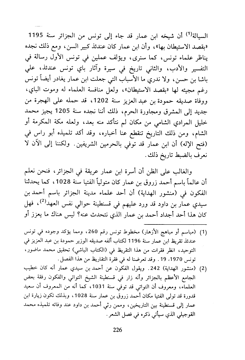 (¬1) (مباسم أو مباهج الأزهار) مخطوط تونس رقم 260، ومما يؤكد وجوده في تونس عندئذ تقريظ ابن عمار سنة 1196 لكتاب ألفه صديقه الوزير حمودة بن عبد العزيز في التوحيد، انظر فقرات من هذا التقريظ في (الكتاب الباشي) تحقيق محمد ماضور، تونس 1970، 19. وقد تعرضنا له في فقرة التقاريظ من هذا الفصل.