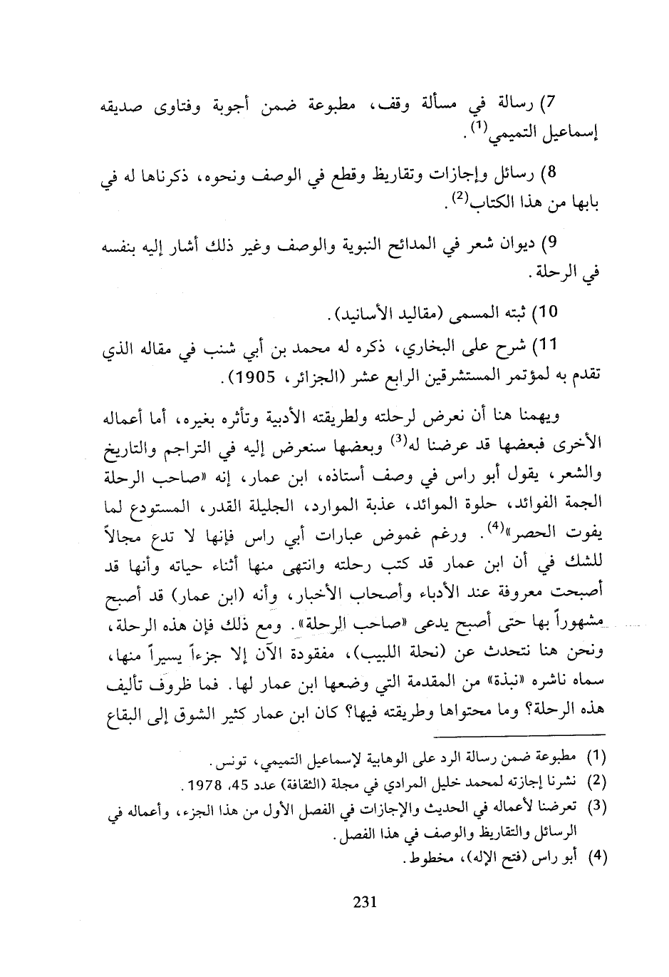 ويهمنا هنا أن نعرض لرحلته ولطريقته الأدبية وتأثره بغيره، أما أعماله الأخرى فبعضها قد عرضنا له (¬3) وبعضها سنعرض إليه في التراجم والتاريخ والشعر، يقول أبو راس في وصف أستاذه، ابن عمار، إنه (صاحب الرحلة الجمة الفوائد، حلوة الموائد، عذبة الموارد، الجليلة القدر، المستودع لما يفوت الحصر) (¬4). ورغم غموض عبارات أبي راس فإنها لا تدع مجالا للشك في أن ابن عمار قد كتب رحلته وانتهى منها أثناء حياته وأنها قد أصبحت معروفة عند الأدباء وأصحاب الأخبار، وأنه (ابن عمار) قد أصبح مشهورا بها حتى أصبح يدعى (صاحب الرحلة). ومع ذلك فإن هذه الرحلة، ونحن هنا نتحدث عن (نحلة اللبيب)، مفقودة الآن إلا جزءا يسيرا منها، سماه ناشره (نبذة) من المقدمة التى وضعها ابن عمار لها, فما ظروف تأليف هذ 5 الرحلة؟ وما محتواها وطريقته فيها؟ كان ابن عمار كثير الشوق إلى البقاع