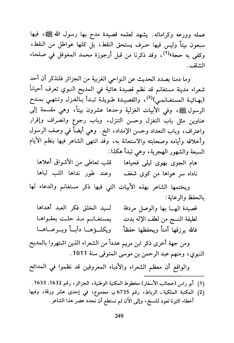 وما دمنا بصدد الحديث عن النواحي الغربية من الجزائر فلنذكر أن أحد شعراء مدينة مستغانم قد نظم قصيدة هائية في المديح النبوي تعرف أحيانا (بهائية المستغانمي) (¬2)، والقصيدة طويلة تبدأ بالغزل وتنتهي بمدح الرسول (صلى الله عليه وسلم)، وفي الأبيات الغزلية وحدها عشرون بيتا، وهي مقسمة إلى عناوين مثل باب التغزل وحسن التنزل، وباب رجوع وانصراف وإقرار واعتراف، وباب التعداد وحسن الإمداد، الخ. وهي أيضا في وصف الرسول وأخلاقه وأيامه وصحابته والاستعانة به، وقد انتهى الشاعر فيها بنظم الأيام السبعة والشهور الهجرية، وهي تبدأ هكذا: