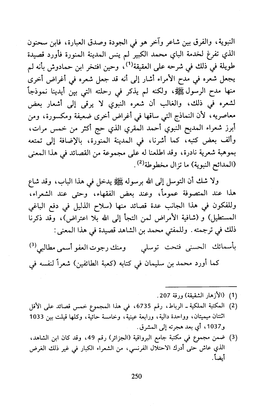 لشعره في ذلك، والغالب أن شعره النبوي لا يرقى إلى أشعار بعض معاصريه، لأن النماذج التي ساقها في أغراض أخرى ضعيفة ومكسورة، ومن أبرز شعراء المديح النبوي أحمد المقري الذي حج أكثر من خمس مرات، وألف بعض كتبه، كما أشرنا، في المدينة المنورة، بالإضافة إلى تمتعه بموهبة شعرية نادرة، وقد اطلعنا له على مجموعة من القصائد في هذا المعنى (المدائم النبوية) ما تزال مخطوطة (¬2).