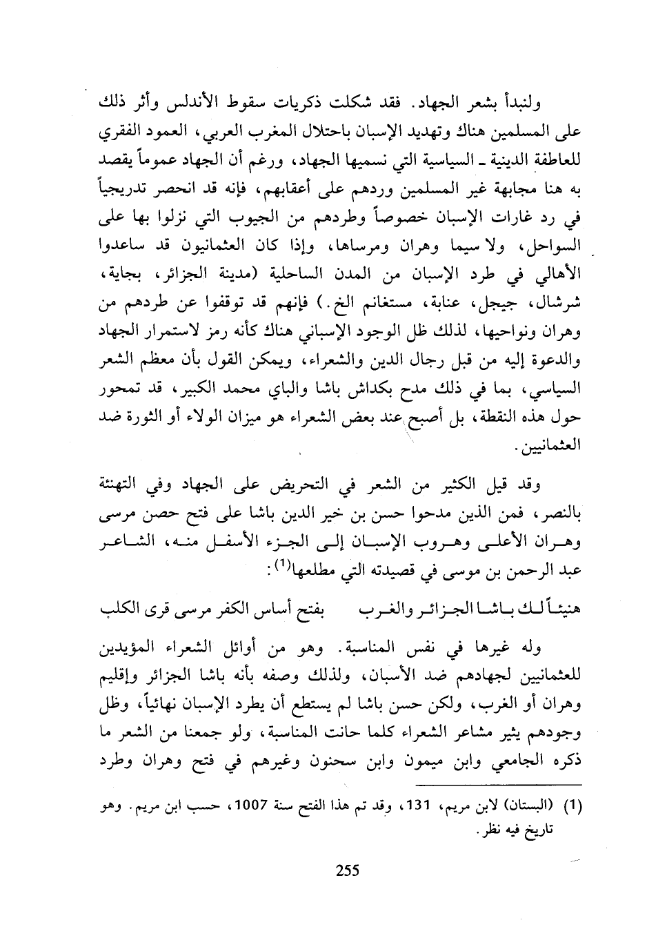 عبد الرحمن بن موسى في قصيدته التي مطلعها (¬1): هنيئا لك باشا الجزائر والغرب ... بفتح أساس الكفر مرسى قرى الكلب وله غيرها في نفس المناسبة. وهو من أوائل الشعراء المؤيدين للعثمانيين لجهادهم ضد الأسبان، ولذلك وصفه بأنه باشا الجزائر وإقليم وهران أو الغرب، ولكن حسن باشا لم يستطع أن يطرد الإسبان نهائيا، وظل وجودهم يثير مشاعر الشعراء كلما حانت المناسبة، ولو جمعنا من الشعر ما