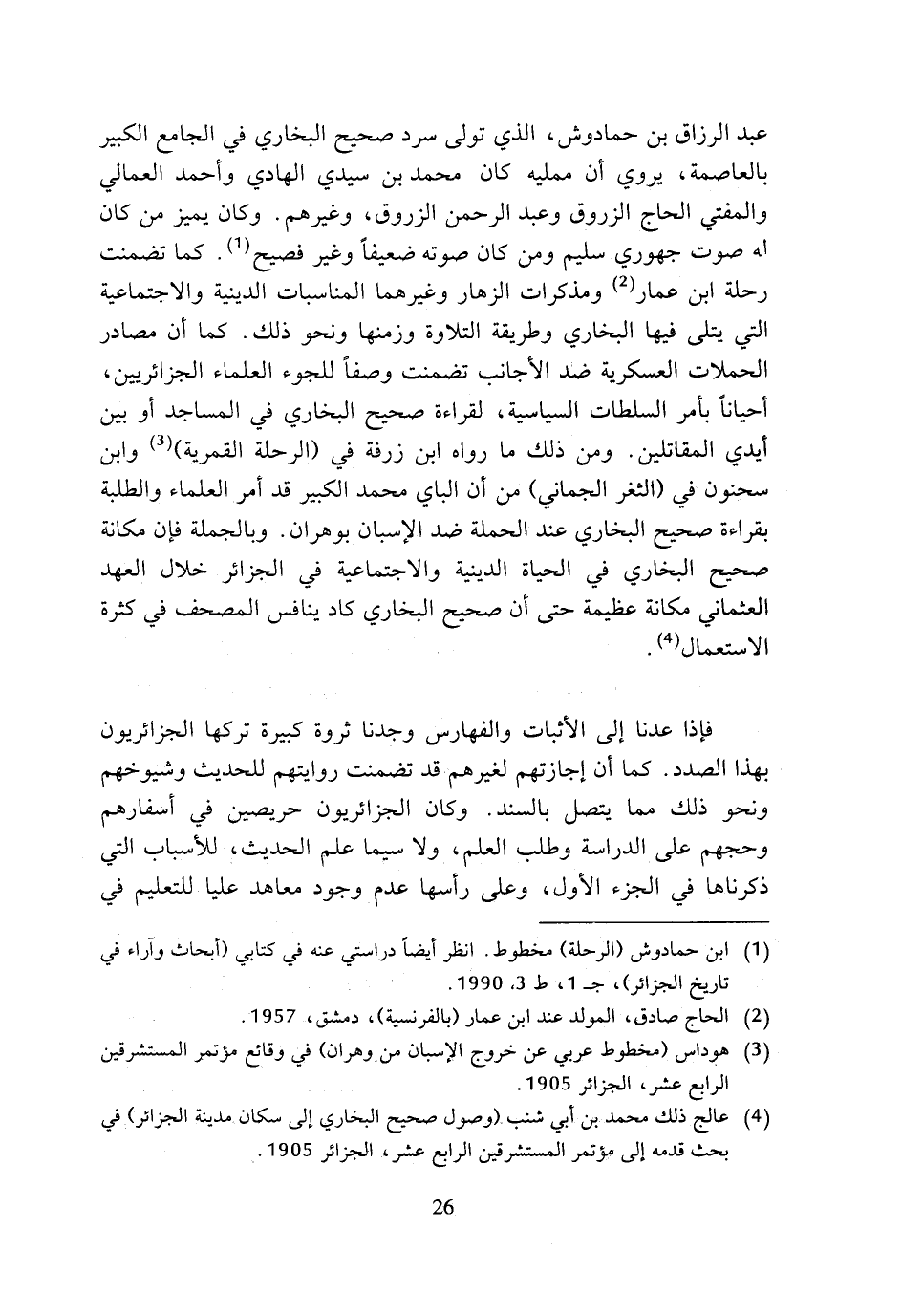 (¬4) عالج ذلك محمد بن أبي شنب (وصول صحيح البخاري إلى سكان مدينة الجزاثر) في بحث قدمه إلى مؤتمر المستشرقين الرابع عشر، الجزائر 1905.