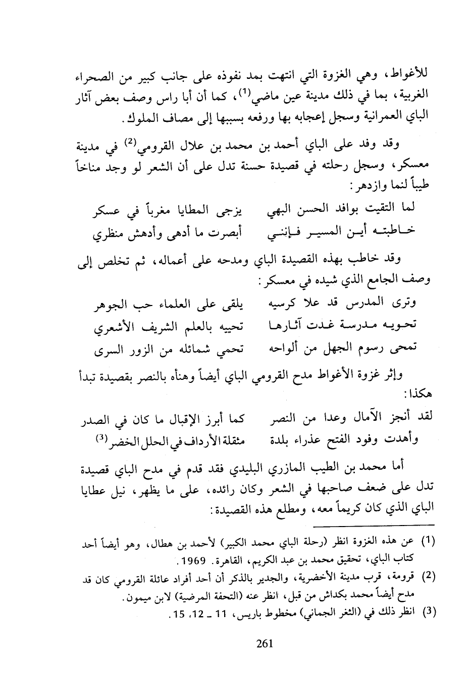 وقد وفد على الباي أحمد بن محمد بن علال القرومي (¬2) في مدينة معسكر، وسجل رحلته في قصيدة حسنة تدل على أن الشعر لو وجد مناخا طيبا لنما وازدهر: