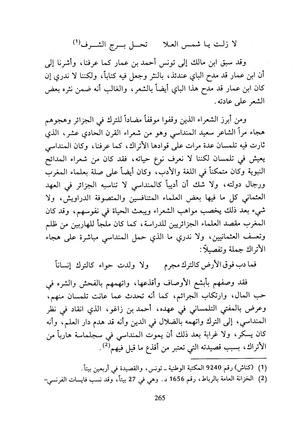 فما دب فوق الأرض كالترك مجرم ... ولا ولدت حواء كالترك إنسانا فقد وصفهم بأبشع الأوصاف وأقذعها، واتهمهم بالفحش والشره في حب المال، وارتكاب الجرائم، كما أنه تحدث عما عانت تلمسان منهم، وعرض بالمفتي التلمساني في عهده، أحمد بن زاغو، الذي انقاد في نظر المنداسي، إلى الترك واتهمه بالضلال في الدين وأنه قد هدم دار العلم، وأنه كان يسكر، ولا غرابة بعد ذلك أن يموت المنداسي في سجلماسة هاربا من الأتراك، بسبب قصيدته التي تعتبر من أقذع ما قيل فيهم (¬2).