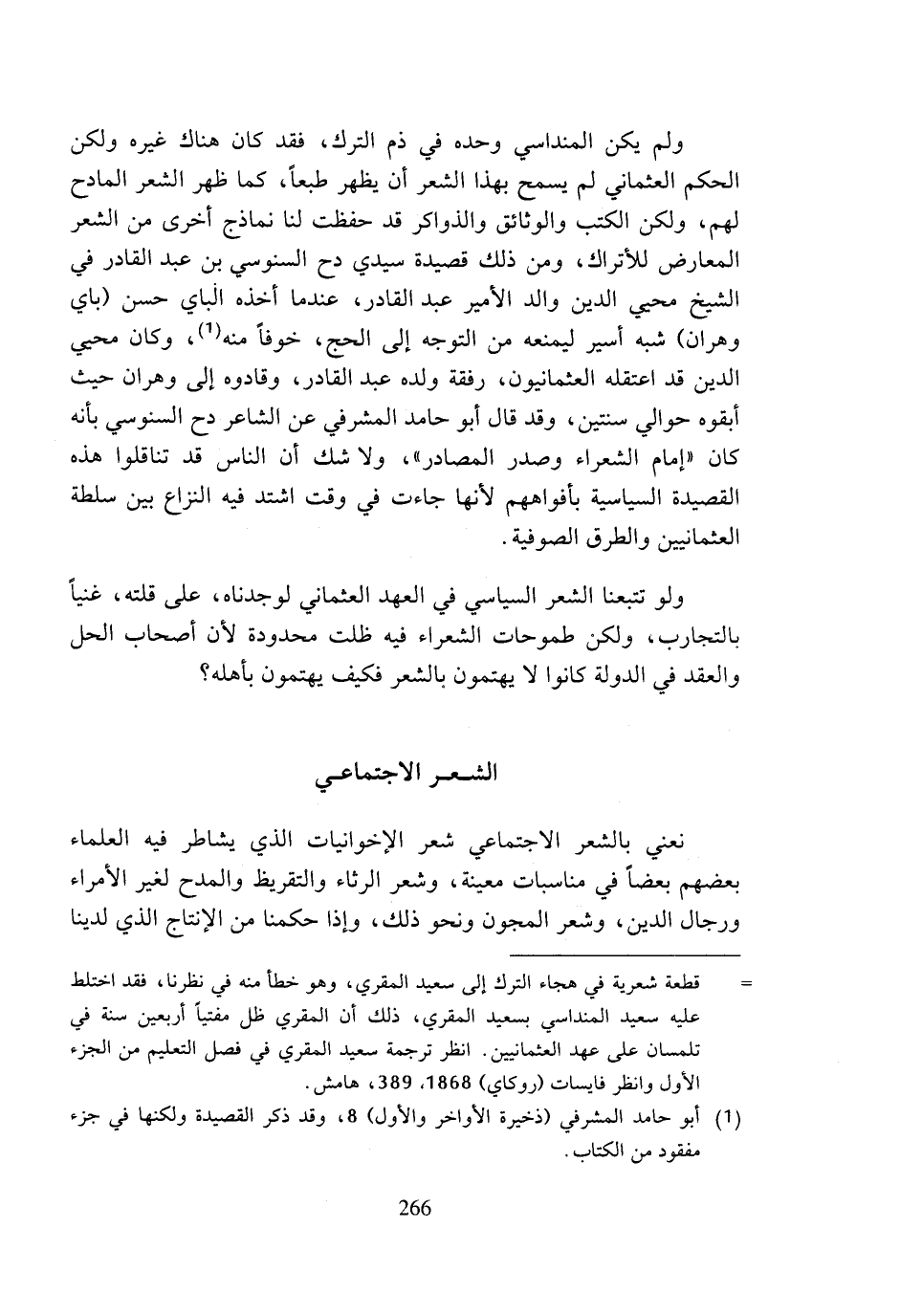 ولو تتبعنا الشعر السياسي في العهد العثماني لوجدناه، على قلته، غنيا بالتجارب، ولكن طموحات الشعراء فيه ظلت محدودة لأن أصحاب الحل والعقد في الدولة كانوا لا يهتمون بالشعر فكيف يهتمون بأهله؟