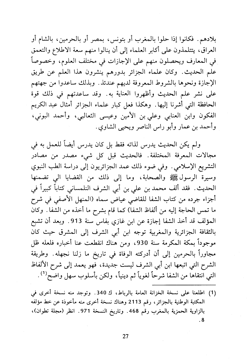 (¬1) اطلعنا على نسخة الخزانة العامة بالرباط، ك 340. وتوجد منه نسخة أخرى في المكتبة الوطنية بالجزائر، رقم 2113 وهناك نسخة أخرى منه مأخودة عن خط مؤلفه بالزاوية الحمزية بالمغرب رقم 468. وتاريخ النسخة 971. انظر (مجلة تطوان)، 8.