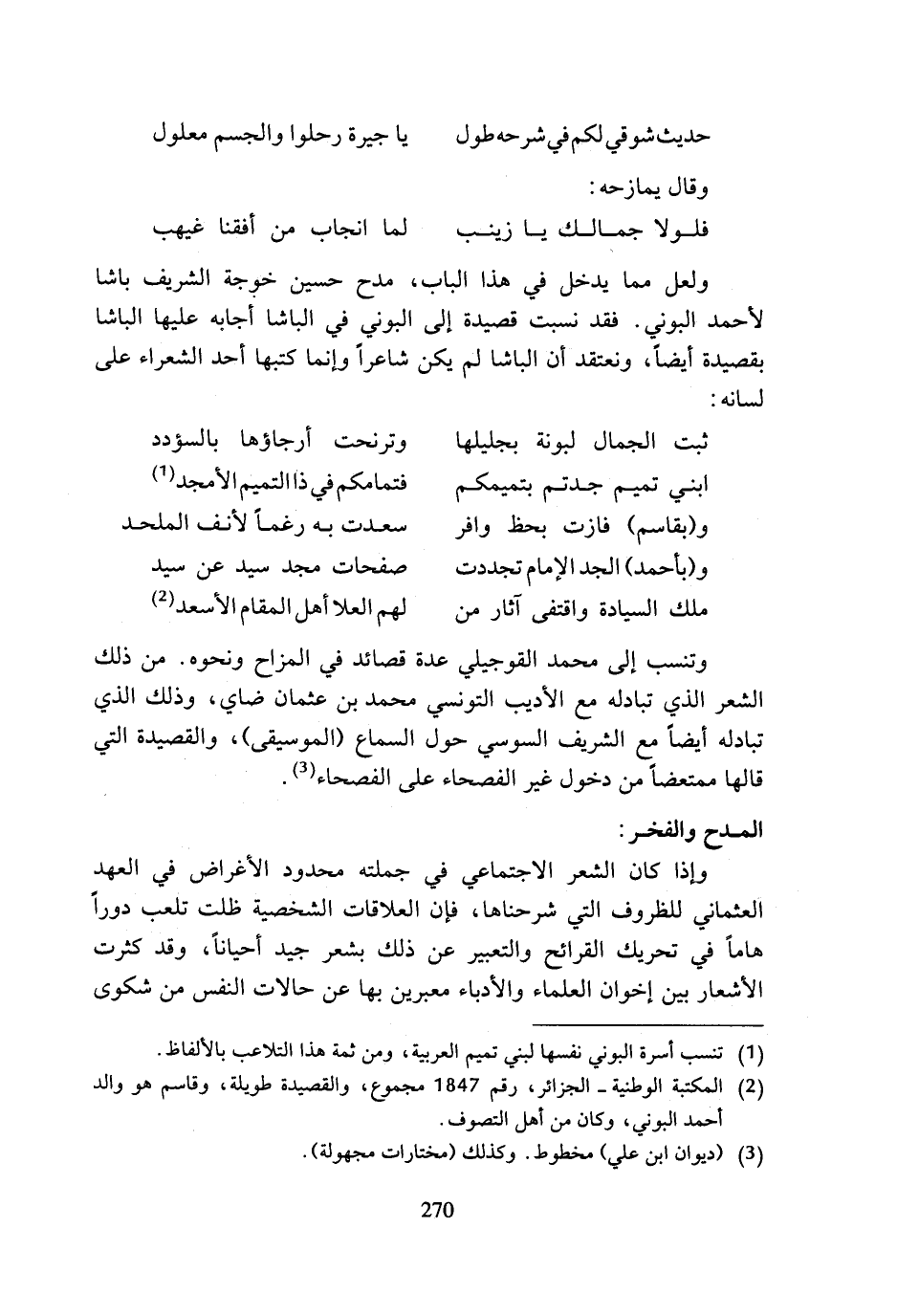 فلولا جمالك يا زينب ... لما انجاب من أفقنا غيهب ولعل مما يدخل في هذا الباب، مدح حسين خوجة الشريف باشا لأحمد البوني. فقد نسبت قصيدة إلى البوني في الباشا أجابه عليها الباشا بقصيدة أيضا، ونعتقد أن الباشا لم يكن شاعرا وإنما كتبها أحد الشعراء على لسانه.