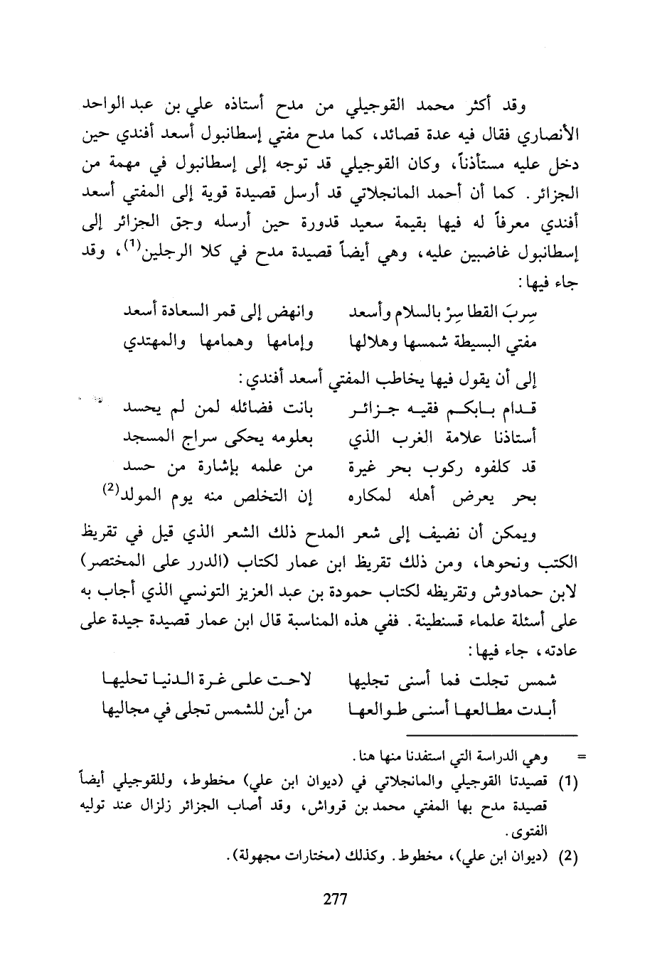 وقد أكثر محمد القوجيلي من مدح أستاذه علي بن عبد الواحد الأنصاري فقال فيه عدة قصائد، كما مدح مفتي إسطانبول أسعد أفندي حين دخل عليه مستأذنا، وكان القوجيلي قد توجه إلى إسطانبول في مهمة من الجزائر. كما أن أحمد المانجلاتي قد أرسل قصيدة قوية إلى المفتي أسعد أفندي معرفا له فيها بقيمة سعيد قدورة حين أرسله وجق الجزائر إلى إسطانبول غاضبين عليه، وهي أيضا قصيدة مدح في كلا الرجلين (¬1)، وقد جاء فيها: