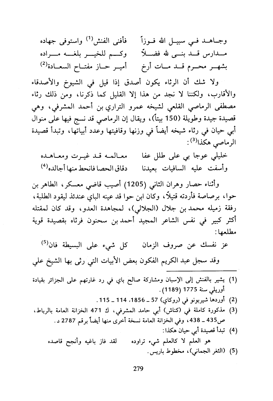 خليلي عوجا بي على طلل عفا ... معالمه قد غيرت ومعاهده وأسفت عليه السافيات بعيدنا ... دقاق الحصا فانحط منها أجالده (¬4) وأثناء حصار وهران الثاني (1205) أصيب قاصي معسكر، الطاهر بن حوا، برصاصة فأردته قتيلا، وكان ابن حوا قد عينه الباي عندئذ ليقود الطلبة، رفقة زميله محمد بن جلال (الجلالي)، لمجاهدة العدو، وقد كان لمقتله أكثر كبير في نفس الشاعر المجيد أحمد بن سحنون فرثاه بقصيدة قوية مطلعها: