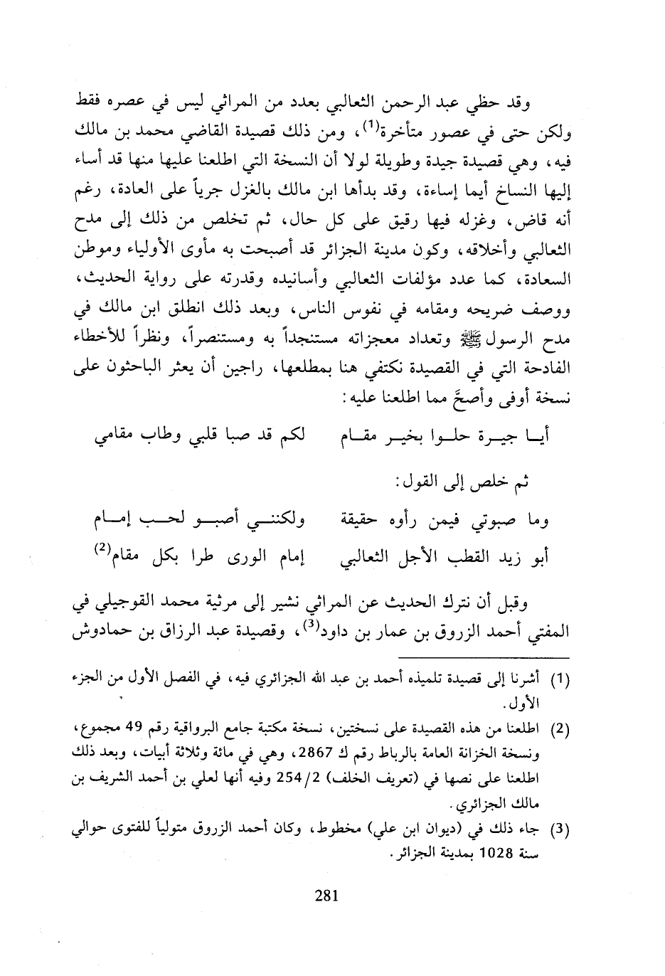 (¬2) اطلعنا من هذه القصيدة على نسختين، نسخة مكتبة جامع البرواقية رقم 49 مجموع، ونسخة الخزانة العامة بالرباط رقم ك 2867، وهي في مائة وثلاثة أبيات، وبعد ذلك اطلعنا على نصها في (تعريف الخلف) 2/ 254 وفيه أنها لعلي بن أحمد الشريف بن مالك الجزائري.