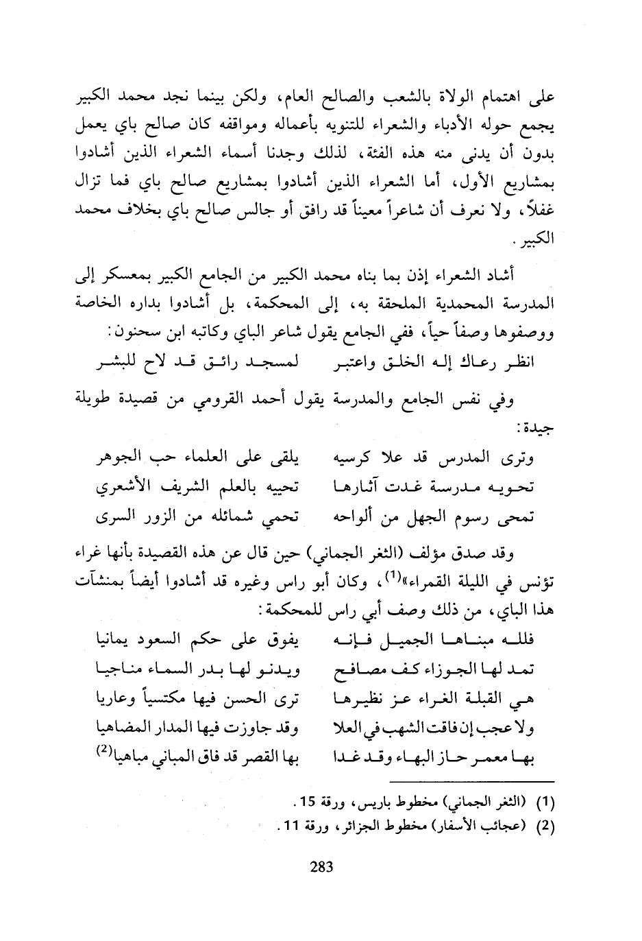 وترى المدرس قد علا كرسيه ... يلقى على العلماء حب الجوهر تحويه مدرسة غدت آثارها ... تحييه بالعلم الشريف الأشعري تمحى رسوم الجهل من ألواحه ... تحمي شمائله من الزور السرى وقد صدق مؤلف (الثغر الجماني) حين قال عن هذه القصيدة بأنها غراء تؤنس في الليلة القمراء) (¬1)، وكان أبو راس وغيره قد أشادوا أيضا بمنشآت هذا الباي، من ذلك وصف أبي راس للمحكمة: