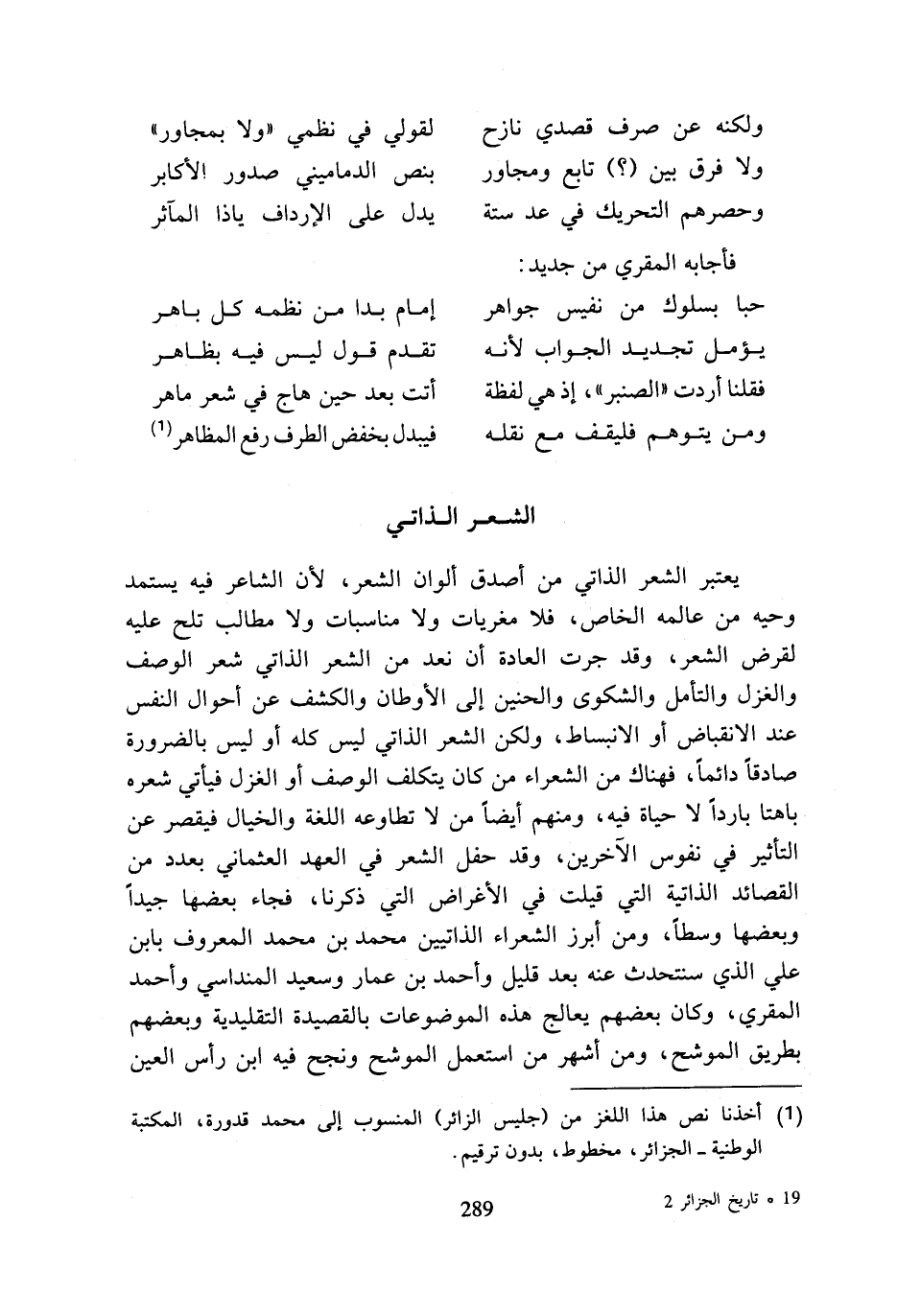 التأثر في نفوس الآخرين، وقد حفل الشعر في العهد العثماني بعدد من القصائد الذاتية التي قيلت في الأغراض التي ذكرنا، فجاء بعضها جيدا وبعضها وسطا، ومن أبرز الشعراء الذاتيين محمد بن محمد المعروف بابن علي الذي سنتحدث عنه بعد قليل وأحمد بن عمار وسعيد المنداسي وأحمد المقري، وكان بعضهم يعالج هذه الموضوعات بالقصيدة التقليدية وبعضهم