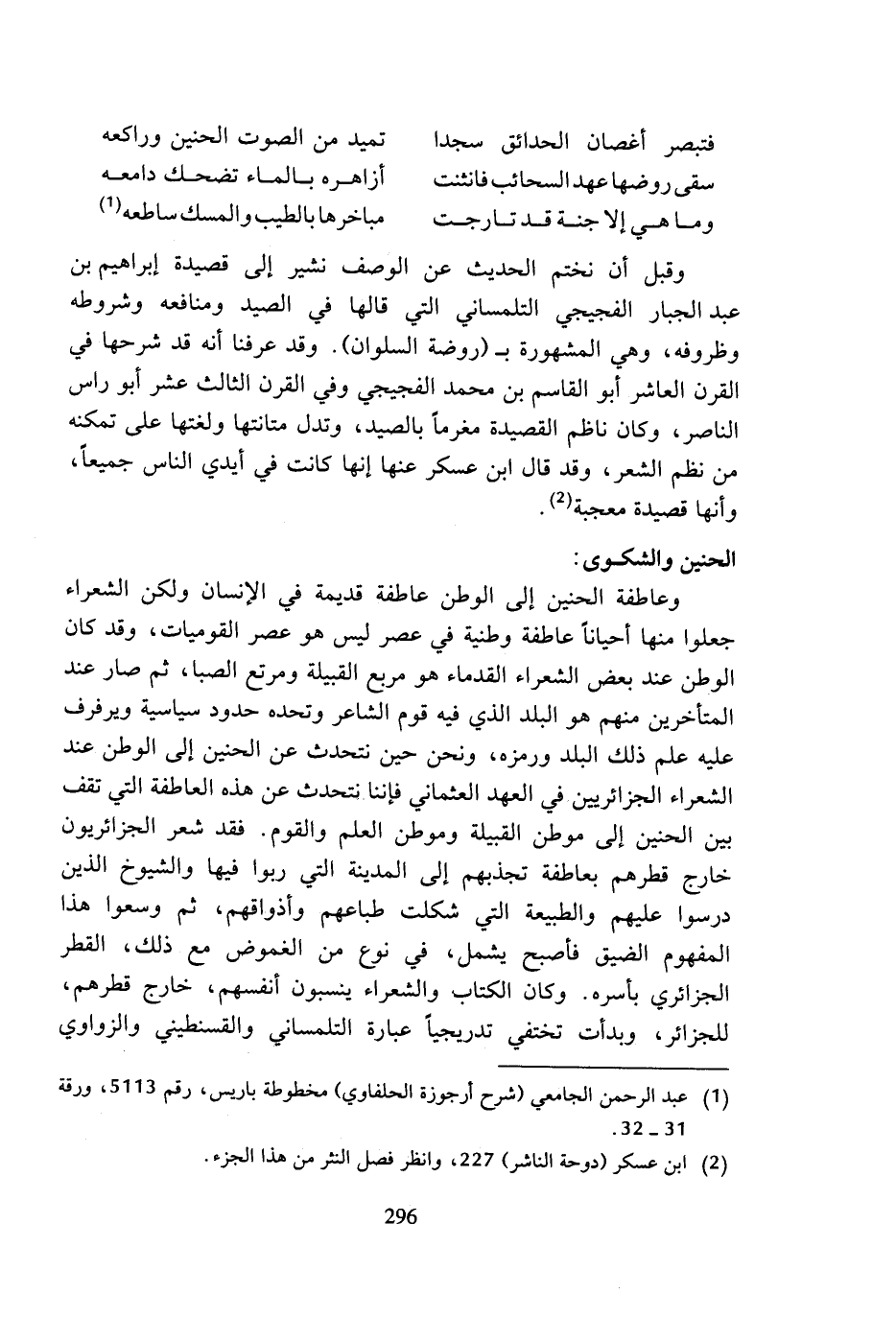 وقبل أن نختم الحديث عن الوصف نشير إلى قصيدة إبراهيم بن عبد الجبار الفجيجي التلمساني التي قالها في الصيد ومنافعه وشروطه وظروفه، وهي المشهورة بـ (روضة السلوان). وقد عرفنا أنه قد شرحها في القرن العاشر أبو القاسم بن محمد الفجيجي وفي القرن الثالث عشر أبو راس الناصر، وكان ناظم القصيدة مغرما بالصيد، وتدل متانتها ولغتها على تمكنه من نظم الشعر، وقد قال ابن عسكر عنها إنها كانت في أيدي الناس جميعا، وأنها قصيدة معجبة (¬2).