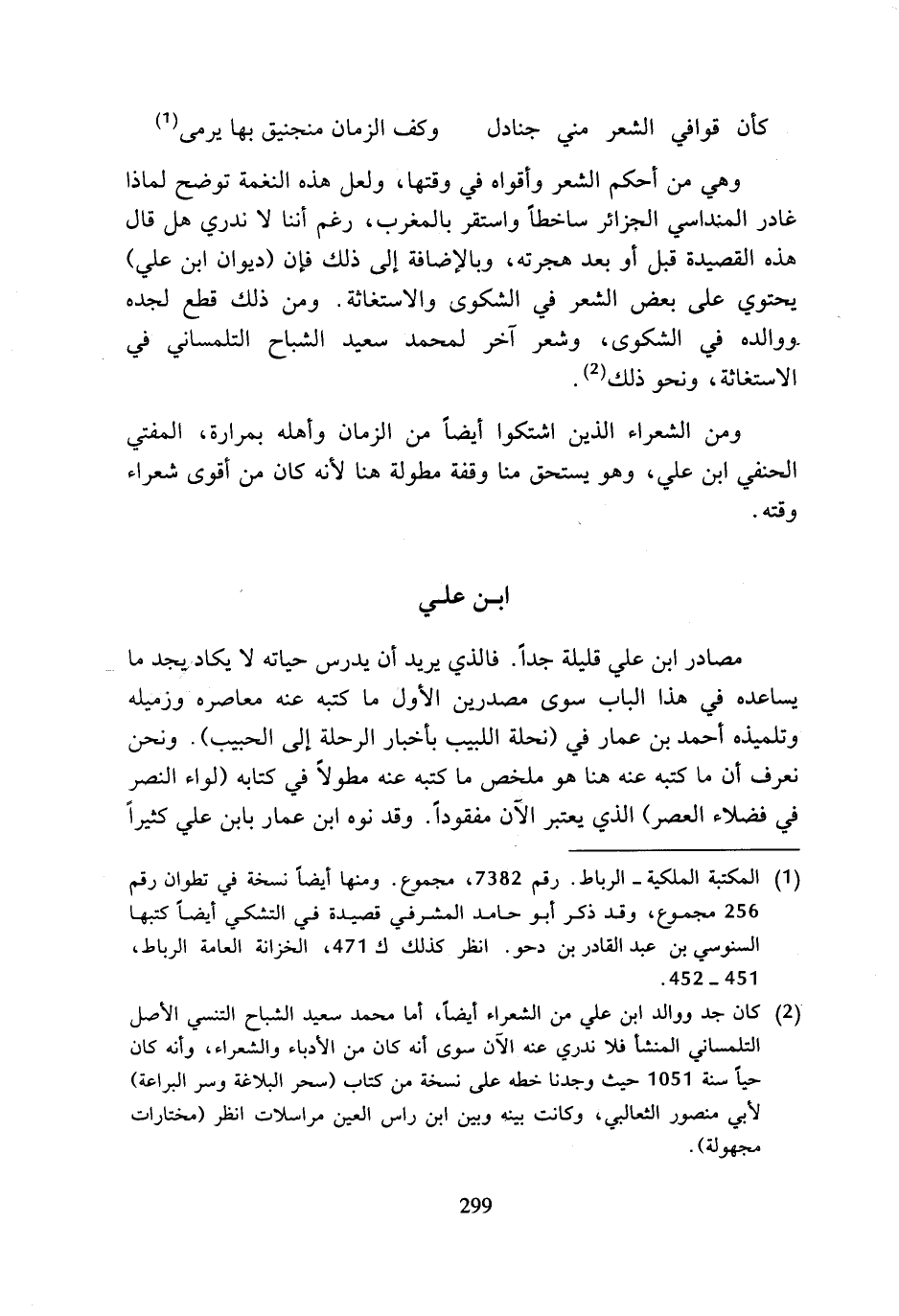 (¬2) كان جد ووالد ابن علي من الشعراء أيضا، أما محمد صعيد الشباح التنسي الأصل التلمساني المنشأ فلا ندري عنه الآن سوى أنه كان من الأدباء والشعراء، وأنه كان حيا سنة 1051 حيث وجدنا خطه على نسخة من كتاب (سحر البلاغة وسر البراعة)