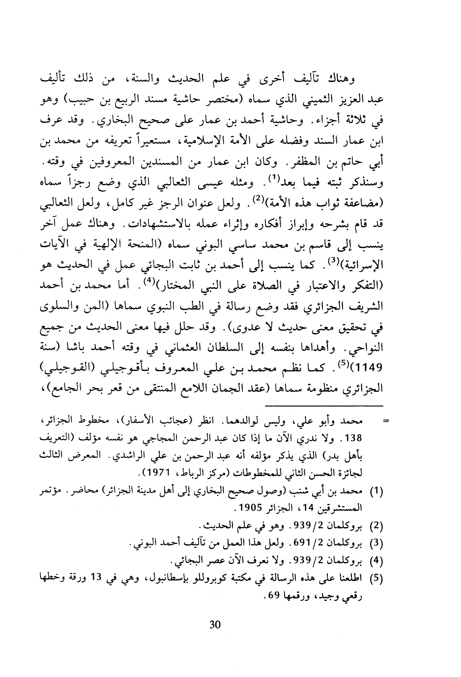 وهناك تآليف أخرى في علم الحديث والسنة، من ذلك تأليف عبد العزيز الثميني الذي سماه (مختصر حاشية مسند الربيع بن حبيب) وهو في ثلاثة أجزاء. وحاشية أحمد بن عمار على صحيح البخاري. وقد عرف ابن عمار السند وفضله على الأمة الإسلامية، مستعيرا تعريفه من محمد بن أبي حاتم بن المظفر 0 وكان ابن عمار من المسندين المعروفين في وقته. وسنذكر ثبته فيما بعد (¬1). ومثله عيسى الثعالبي الذي وضع رجزا سماه (مضاعفة ثواب هذه الأمة) (¬2). ولعل عنوان الرجز غير كامل، ولعل الثعالبي قد قام بشرحه وإبراز أفكاره وإثراء عمله بالاستشهادات. وهناك عمل آخر ينسب إلى قاسم بن محمد ساسي البوبي سماه (المنحة الإلهية في الآيات الإسرائية) (¬3). كما ينسب إلى أحمد بن ثابت البجائي عمل في الحديث هو (التفكر والاعتبار في الصلاة على النبي المختار) (¬4). أما محمد بن أحمد الشريف الجزائري فقد وضع رسالة في الطب النبوي سماها (المن والسلوى في تحقيق معنى حديثا لا عدوى). وقد حلل فيها معنى الحديث من جميع النواحي. وأهداها بنفسه إلى السلطان العثماني في وقته أحمد باشا (سنة 1149) (¬5). كما نظم محمد بن علي المعروف بأقوجيلي (القوجيلي) الجزائري منظومة سماها (عقد الجمان اللامع المنتقى من قعر بحر الجامع)،