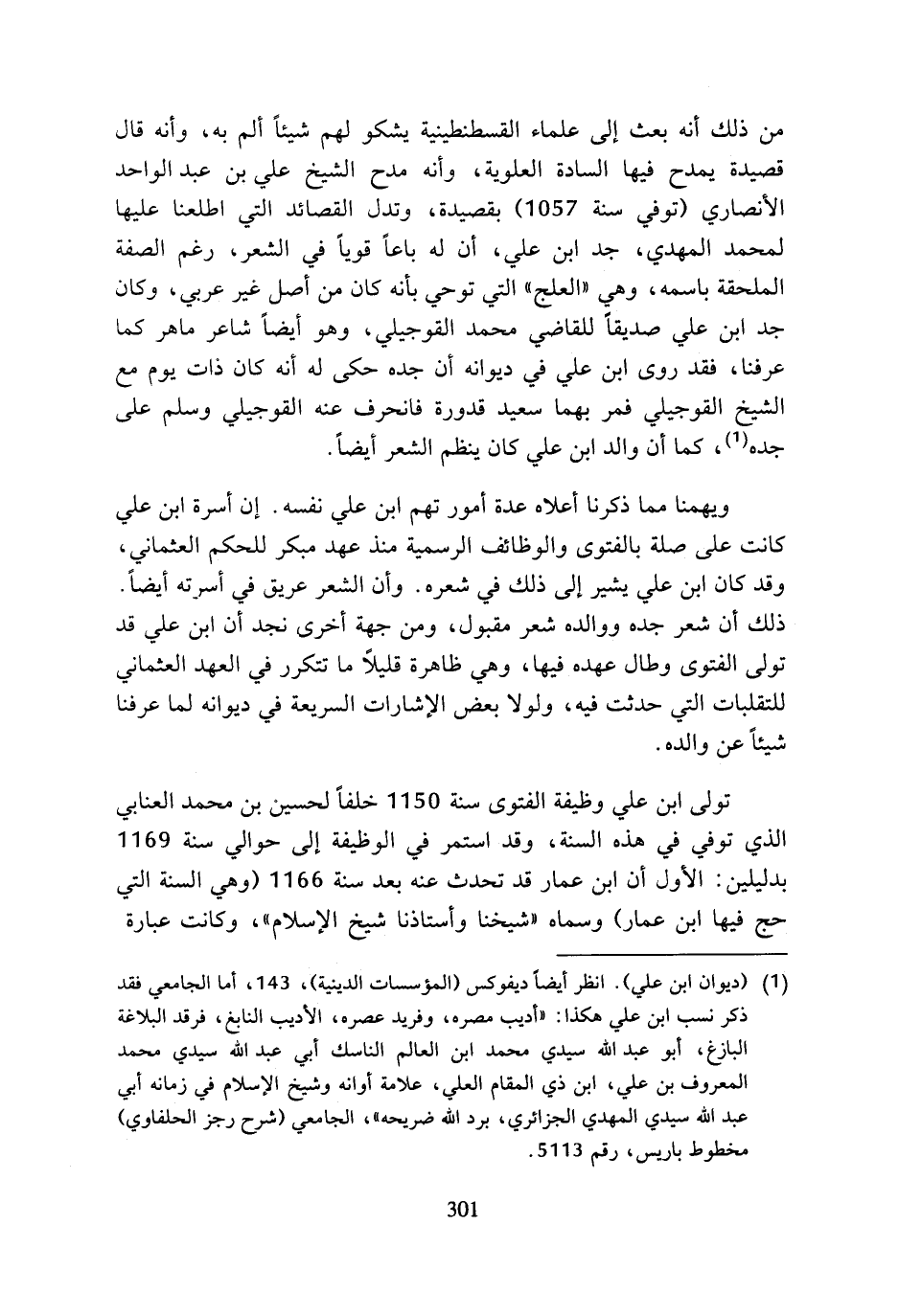 ويهمنا مما ذكرنا أعلاه عدة أمور تهم ابن علي نفسه. إن أسرة ابن علي كانت على صلة بالفتوى والوظائف الرسمية منذ عهد مبكر للحكم العثماني، وقد كان ابن علي يشير إلى ذلك في شعره. وأن الشعر عريق في أسرته أيضا. ذلك أن شعر جده ووالده شعر مقبول، ومن جهة أخرى نجد أن ابن علي قد تولى الفتوى وطال عهده فيها، وهي ظاهرة قليلا ما تتكرر في العهد العثماني للتقلبات التي حدثت فيه، ولولا بعض الإشارات السريعة في ديوانه لما عرفنا شيئا عن والده.