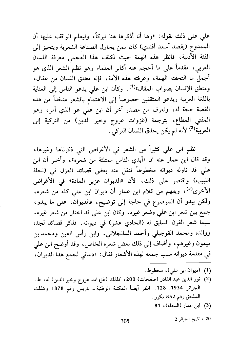 علي على ذلك بقوله: (وها أنا أذكرها هنا تبركا، وليعلم الواقب عليها أن الممدوح (يقصد أسعد أفندي) كان ممن يحاول الصناعة الشعرية ويتحيز إلى الفئة الأدبية، فانظر هذه الهمة حيث تكلف هذا العجمي معرفة اللسان العربي، مقدما على ما أحجم عنه أكابر العلماء وهو نظم الشعر الذي هو أجمل ما التحفته الهمة، وعرفته هذه الأمة، فإنه مطلق اللسان من عقال، ومنطق الإنسان بصواب المقال) (¬1). وكأن ابن علي يدعو الناس إلى العناية باللغة العربية ويدعو المثقفين خصوصا إلى الاهتمام بالشعر متخذا من هذه القصة حجة له، ونعرف من مصدر آخر أن ابن علي هو الذي أمر، وهو المفتي المطاع، بترجمة (غزوات عروج وخير الدين) من التركية إلى العربية (¬2) لأنه لم يكن يحذق اللسان التركي.