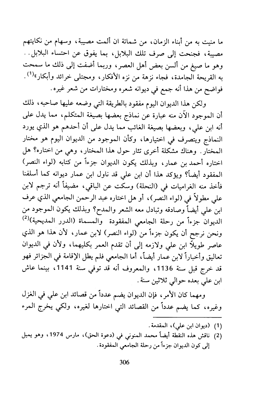 ولكن هذا الديوان اليوم معقود بالطريقة التي وضعه عليها صاحبه، ذلك أن الموجود الآن منه عبارة عن نماذج بعضها بصيغة المتكلم، مما يدل على أنه ابن علي، وبعضها بصيغة الغائب مما يدل على أن أحدهم هو الذي يورد النماذج ويتصرف في اختيارها، وكأن الموجود من الديوان اليوم هو مختار المختار. وهناك مشكلة أخرى تثار حول هذا المختار، وهي من اختاره؟ هل اختاره أحمد بن عمار، وبذلك يكون الديوان جزءا من كتابه (لواء النصر) المفقود أيضا؟ ويؤكد هذا أن ابن علي قد ناول ابن عمار ديوانه كما أسلفنا فأخذ منه الغراميات في (النحلة) وسكت عن الباقي، مضيفا أنه ترجم لابن علي مطولا في (لواء النصر)، أو هل اختاره عبد الرحمن الجامعي الذي عرف ابن علي أيضا وصادقه وتبادل معه الشعر والمدح؟ وبذلك يكون الموجود من الديوان جزءا من رحلة الجامعي المفقودة والمسماة (الدرر المديحية) (¬2) ونحن نرجح أن يكون جزءا من (لواء النصر) لابن عمار، لأن هذا هو الذي عاصر طويلا ابن علي ولازمه إلى أن تقدم العمر بكليهما، ولأن في الديوان