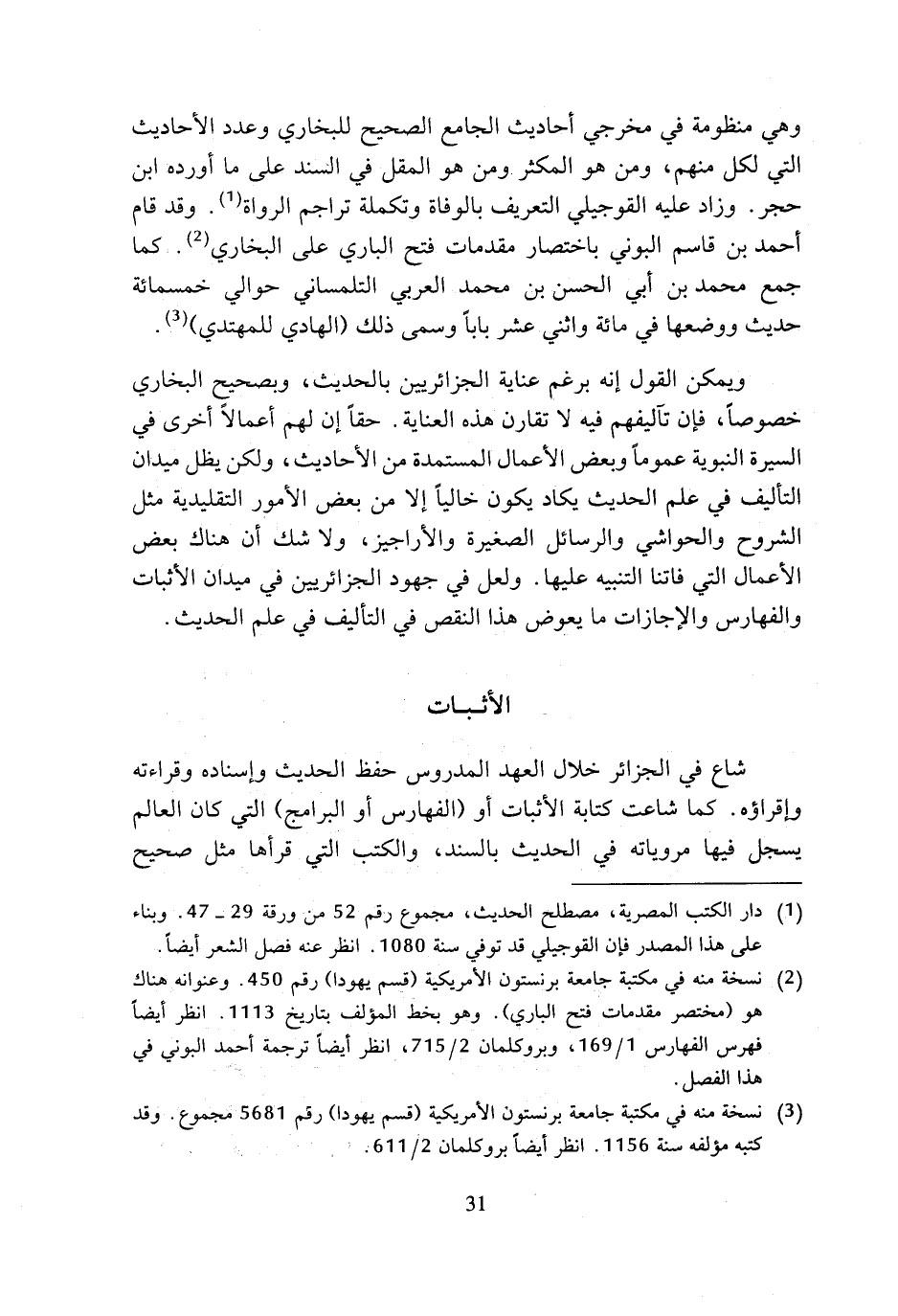 وهي منظومة في مخرجي أحاديث الجامع الصحيح للبخاري وعدد الأحاديث التي لكل منهم، ومن هو المكثر ومن هو المقل في السند على ما أورده ابن حجر. وزاد عليه القوجيلي التعريف بالوفاة وتكملة تراجم الرواة (¬1). وقد قام أحمد بن قاسم البوني باختصار مقدمات فتح الباري على البخاري (¬2). كما جمع محمد بن أبي الحسن بن محمد العربي التلمساني حوالي خمسمائة حديث ووضعها في مائة واثني عشر بابا وسمى ذلك (الهادي للمهتدي) (¬3). ويمكن القول إنه برغم عناية الجزائريين بالحديث، وبصحيح البخاري خصوصا، فإن تآليفهم فيه لا تقارن هذه العناية. حقا إن لهم أعمالا أخرى في السيرة النبوية عموما وبعض الأعمال المستمدة من الأحاديث، ولكن يظل ميدان التأليف في علم الحديث يكاد يكون خاليا إلا من بعض الأمور التقليدية مثل الشروح والحواشي والرسائل الصغيرة والأراجيز، ولا شك أن هناك بعض الأعمال التي فاتنا التنبيه عليها. ولعل في جهود الجزائريين في ميدان الأثبات والفهارس والإجازات ما يعوض هذا النقص في التأليف في علم الحديث.