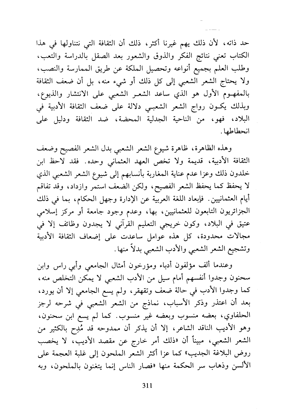 حد ذاته، لأن ذلك يهم غيرنا أكثر، ذلك أن الثقافة التي نتناولها في هذا الكتاب تعني نتائج الفكر والذوق والشعور بعد الصقل بالدراسة والتعب، وطلب العلم بجميع أنواعه وتحصيل الملكة عن طريق الممارسة والنصب، ولا يحتاج الشعر الشعبي إلى كل ذلك أو شيء منه، بل أن ضعف الثقافة بالمفهوم الأول هو الذي ساعد الشعر الشعبي على الانتشار والذيوع، وبذلك يكون رواج الشعر الشعبي دلالة على ضعف الثقافة الأدبية في البلاد، فهو، من الناحية الجدلية المحضة، ضد الثقافة ودليل على انحطاطها.