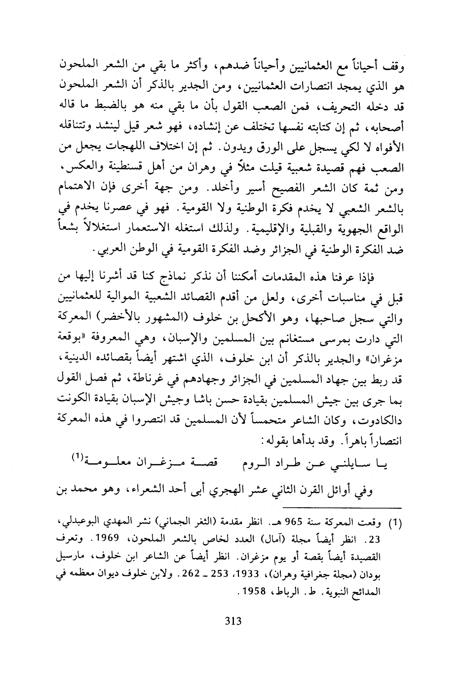 (¬1) …وقعت المعركة سنة 965 هـ. انظر مقدمة (الثغر الجماني) نشر المهدي البوعبدلي، 23. انظر أيضا مجلة (آمال) العدد الخاص بالشعر الملحون، 1969. وتعرف القصيدة أيضا بقصة أو يوم مزغران. انظر أيضا عن الشاعر ابن خلوف، مارسيل بودان (مجلة جغرافية وهران)، 1933، 253 - 262. ولابن خلوف ديوان معظمه في المدائح النبوية. ط) الرباط، 1958.