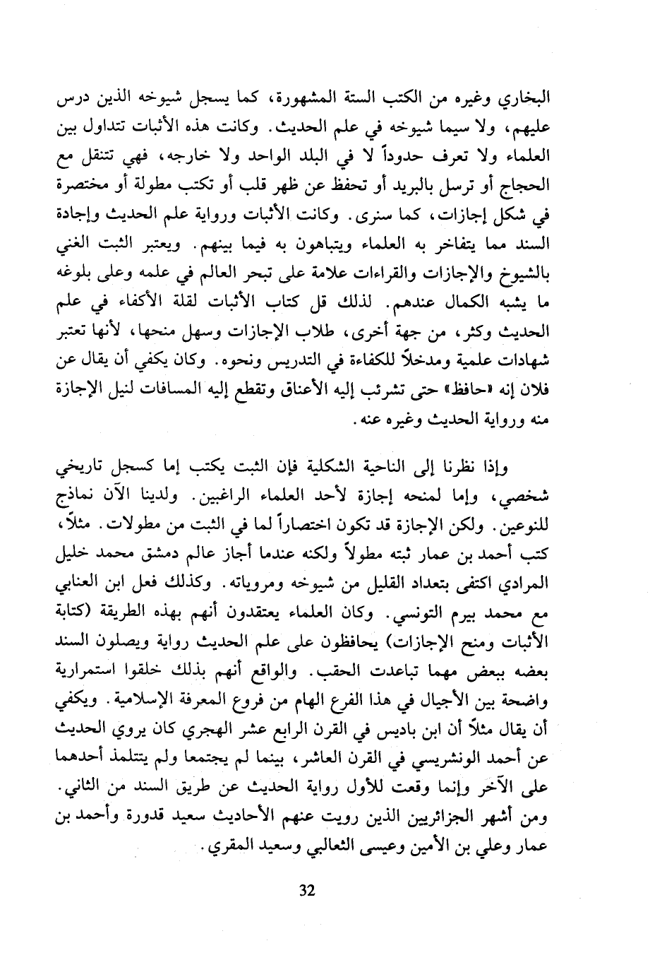 وإذا نظرنا إلى الناحية الشكلية فإن الثبت يكتب إما كسجل تاريخي شخصي، وإما لمنحه إجازة لأحد العلماء الراغبين. ولدينا الآن نماذج للنوعين. ولكن الإجازة قد تكون اختصارا لما في الثبت من مطولات. مثلا، كتب أحمد بن عمار ثبته مطولا ولكنه عندما أجاز عالم دمشق محمد خليل المرادي اكتفى بتعداد القليل من شيوخه ومروياته. وكذلك فعل ابن العنابي مع محمد بيرم التونسي. وكان العلماء يعتقدون أنهم بهذه الطريقة (كتابة الأثبات ومنح الإجازات) يحافظون على علم الحديث رواية ويصلون السند بعضه ببعض مهما تباعدت الحقب. والواقع أنهم بذلك خلقوا استمرارية واضحة بين الأجيال في هذا الفرع الهام من فروع المعرفة الإسلامية. ويكفي أن يقال مثلا أن ابن باديس في القرن الرابع عشر الهجري كان يروي الحديث عن أحمد الونشريسي في القرن العاشر، بينما لم يجتمعا ولم يتتلمذ أحدهما على الآخر وإنما وقعت للأول رواية الحديث عن طريق السند من الثاني. ومن أشهر الجزائريين الذين رويت عنهم الأحاديث سعيد قدورة وأحمد بن عمار وعلي بن الأمين وعيسى الثعالبي وسعيد المقري.