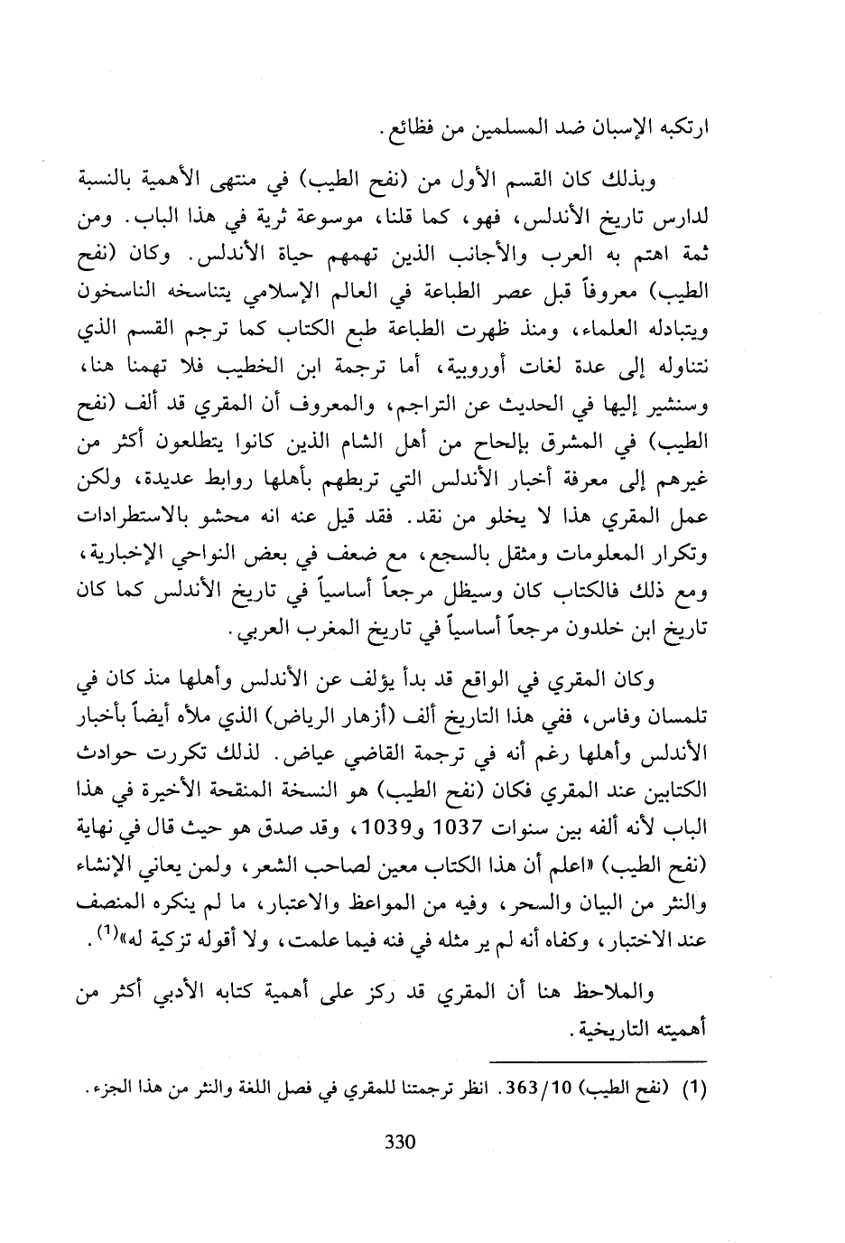 وبذلك كان القسم الأول من (نفح الطيب) في منتهى الأهمية بالنسبة لدارس تاريخ الأنداس، فهو، كما قلنا، موسوعة ثرية في هذا الباب. ومن ثمة اهتم به العرب والأجانب الذين تهمهم حياة الأندلس. وكان (نفح الطيب) معروفا قبل عصر الطباعة في العالم الإسلامي يتناسخه الناسخون ويتبادله العلماء، ومنذ ظهرت الطباعة طبع الكتاب كما ترجم القسم الذي نتناوله إلى عدة لغات أوروبية، أما ترجمة ابن الخطيب فلا تهمنا هنا، وسنشير إليها في الحديث عن التراجم، والمعروف أن المقري قد ألف (نفح الطيب) في المشرق بإلحاح من أهل الشام الذين كانوا يتطلعون أكثر من غيرهم إلى معرفة أخبار الأندلس التي تربطهم بأهلها روابط عديدة، ولكن عمل المقري هذا لا يخلو من نقد. فقد قيل عنه انه محشو بالاستطرادات وتكرار المعلومات ومثقل بالسجع، مع ضعف في بعض النواحي الإخبارية، ومع ذلك فالكتاب كان وسيظل مرجعا أساسيا في تاريخ الأندلس كما كان تاريخ ابن خلدون مرجعا أساسيا في تاريخ المغرب العربي.