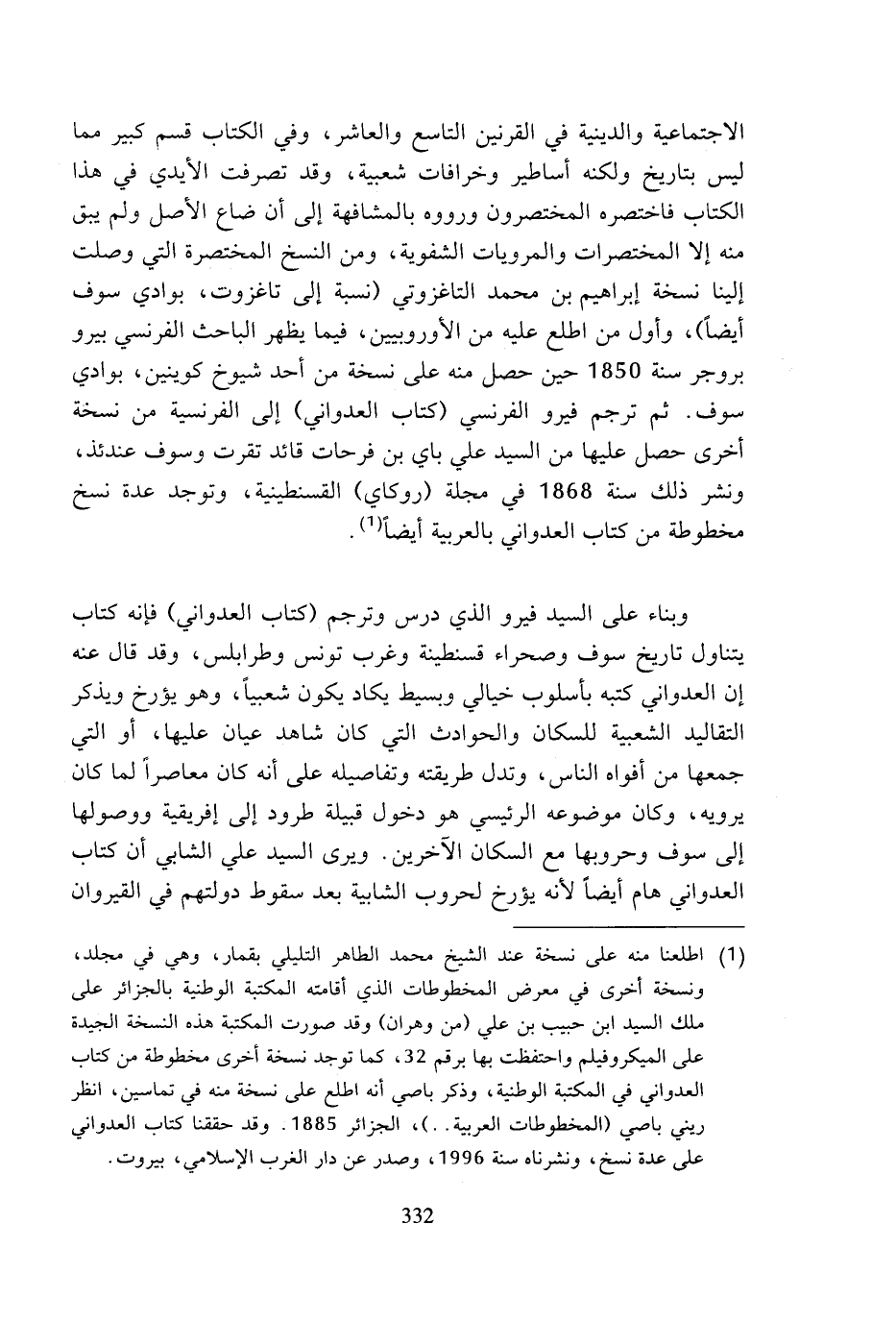 (¬1) اطلعنا منه على نسخة عند الشيخ محمد الطاهر التليلي بقمار، وهي في مجلد، ونسخة أخرى في معرض المخطوطات الذي أقامته المكتبة الوطنية بالجزائر على ملك السيد ابن حبيب بن علي (من وهران) وقد صورت المكتبة هذه النسخة الجيدة على الميكروفيلم واحتفظت بها برقم 32، كما توجد نسخة أخرى مخطوطة من كتاب العدواني في المكتبة الوطنية، وذكر باصي أنه اطلع على نسخة منه في تماسين، انظر ريني باصي (المخطوطات العربية ..)، الجزائر 1885. وقد حققنا كتاب العدواني على عدة نسخ، ونشرناه سنة 1996، وصدر عن دار الغرب الإسلامي، بيروت.