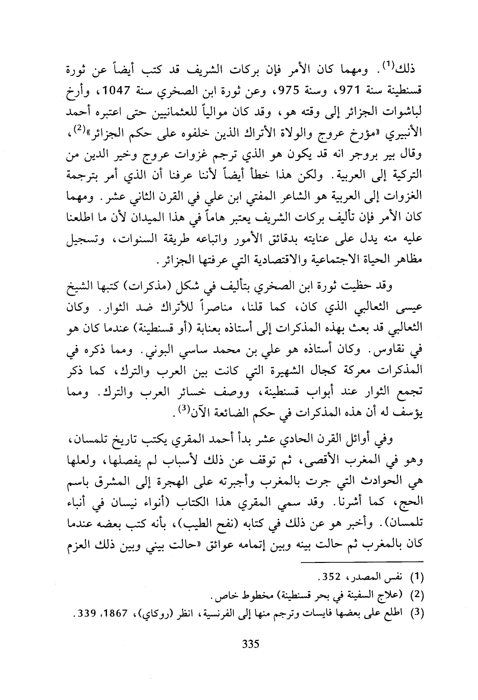 الأنبيري (مؤرخ عروج والولاة الأتراك الذين خلفوه على حكم الجزائر) (¬2)، وقال بير بروجر انه قد يكون هو الذي ترجم غزوات عروج وخير الدين من التركية إلى العربية. ولكن هذا خطأ أيضا لأننا عرفنا أن الذي أمر بترجمة الغزوات إلى العربية هو الشاعر المفتي ابن علي في القرن الثاني عشر. ومهما كان الأمر فإن تأليف بركات الشريف يعتبر هاما في هذا الميدان لأن ما اطلعنا عليه منه يدل على عنايته بدقائق الأمور واتباعه طريقة السنوات، وتسجيل مظاهر الحياة الاجتماعية والاقتصادية التي عرفتها الجزائر.