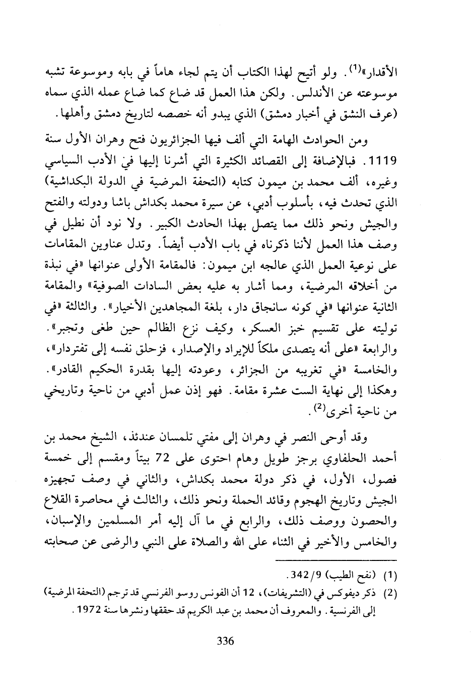 (¬2) ذكر ديفوكس في (التشريفات)، 12 أن الفونس روسو الفرنسي قد ترجم (التحفة المرضية) إلى الفرنسية. والمعروف أن محمد بن عبد الكريم قد حققها ونشرها سنة 1972.