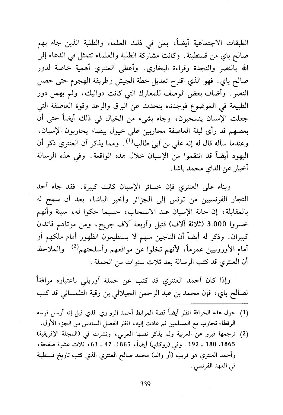 صالح باي. فهو الذي اقترح تعديل خطة الجيش وطريقة الهجوم حتى حصل النصر. وأضاف بعض الوصف للمعارك التي كانت دواليك، ولم يهمل دور الطبيعة في الموضوع فوجدناه يتحدث عن البرق والرعد وقوة العاصفة التي جعلت الإسبان ينسحبون، وجاء بشيء من الخيال في ذلك أيضا حتى أن بعضهم قد رأى ليلة العاصفة محاربين على خيول بيضاء يحاربون الإسبان، وعندما سأله قال له إنه علي بن أبي طالب (¬1). ومما يذكر أن العنتري ذكر أن اليهود أيضا قد انتقموا من الإسبان خلال هذه الواقعة. وفي هذه الرسالة أخبار عن الداي محمد باشا.