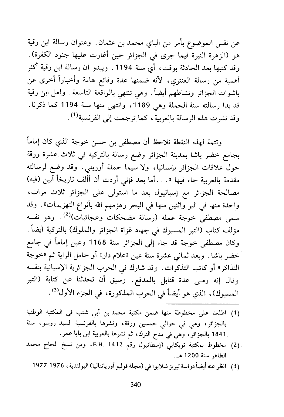 واحدة منها في البر واثنين منها في البحر وهزمهم الله بأنواع التهزيمات). وقد سمى مصطفى خوجة عمله (رسالة مضحكات وعجائبات) (¬2). وهو نفسه مؤلف كتاب (التبر المسبوك في جهاد غزاة الجزائر والملوك) بالتركية أيضا. وكان مصطفى خوجة قد جاء إلى الجزائر سنة 1168 وعين إماما في جامع خضر باشا. وبعد ثماني عشرة سنة عين (علام دار) أو حامل الراية ثم (خوجة التذاكر) أو كاتب التذكرات. وقد شارك في الحرب الجزائرية الإسبانية بنفسه وقال إنه رمى عدة قنابل بالمدفع. وسبق أن تحدثنا عن كتابة (التبر المسبوك)، الذي هو أيضا في الحرب المذكورة، في الجزء الأول (¬3).