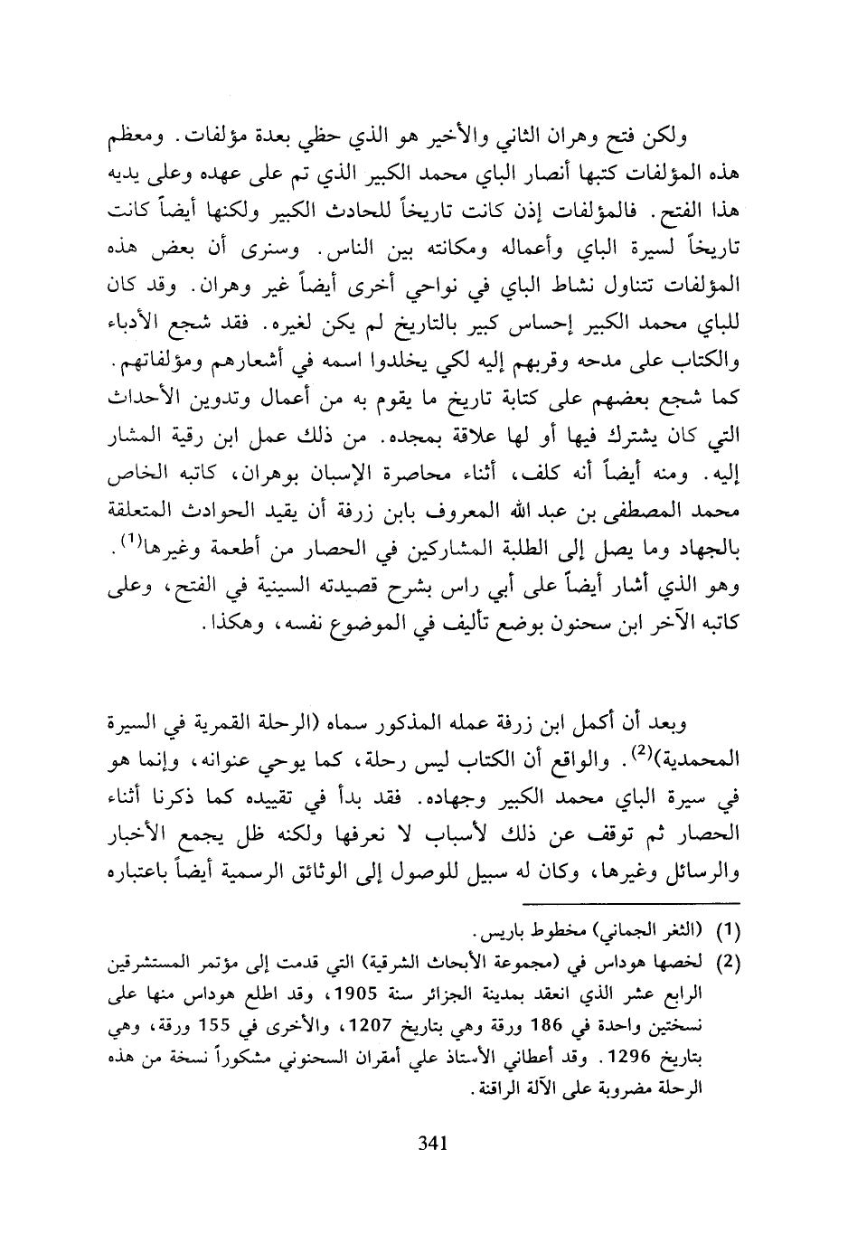 ولكن فتح وهران الثاني والأخير هو الذي حظي بعدة مؤلفات. ومعظم هذه المؤلفات كتبها أنصار الباي محمد الكبير الذي تم على عهده وعلى يديه هذا الفتح. فالمؤلفات إذن كانت تاريخا للحادث الكبير ولكنها أيضا كانت تاريخا لسيرة الباي وأعماله ومكانته بين الناس. وسنرى أن بعض هذه المؤلفات تتناول نشاط الباي في نواحي أخرى أيضا غير وهران. وقد كان للباي محمد الكبير إحساس كبير بالتاريخ لم يكن لغيره. فقد شجع الأدباء والكتاب على مدحه وقربهم إليه لكي يخلدوا اسمه في أشعارهم ومؤلفاتهم. كما شجع بعضهم على كتابة تاريخ ما يقوم به من أعمال وتدوين الأحداث التي كان يشترك فيها أو لها علاقة بمجده. من ذلك عمل ابن رقية المشار إليه. ومنه أيضا أنه كلف، أثناء محاصرة الإسبان بوهران، كاتبه الخاص محمد المصطفى بن عبد الله المعروف بابن زرفة أن يقيد الحوادث المتعلقة بالجهاد وما يصل إلى الطلبة المشاركين في الحصار من أطعمة وغيرها (¬1). وهو الذي أشار أيضا على أبي راس بشرح قصيدته السينية في الفتح، وعلى كاتبه الآخر ابن سحنون بوضع تأليف في الموضوع نفسه، وهكذا.